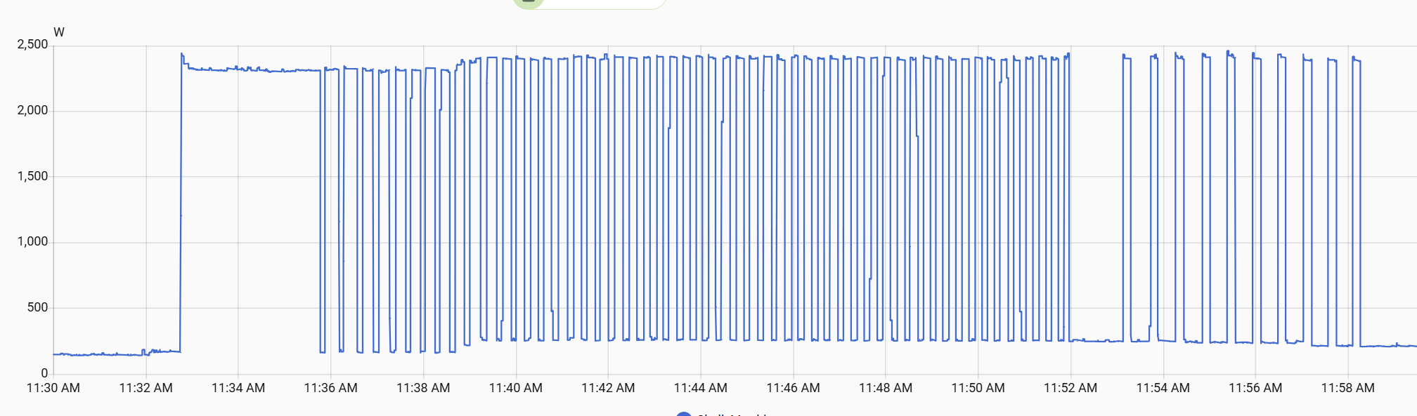 Bei stark taktenden Verbrauchern wie Herdplatten, wird der Fronius immer einen Restnetzbezug haben. Beispiel einer Herdplatte in höherer zeitlicher Auflösung ![]() |
