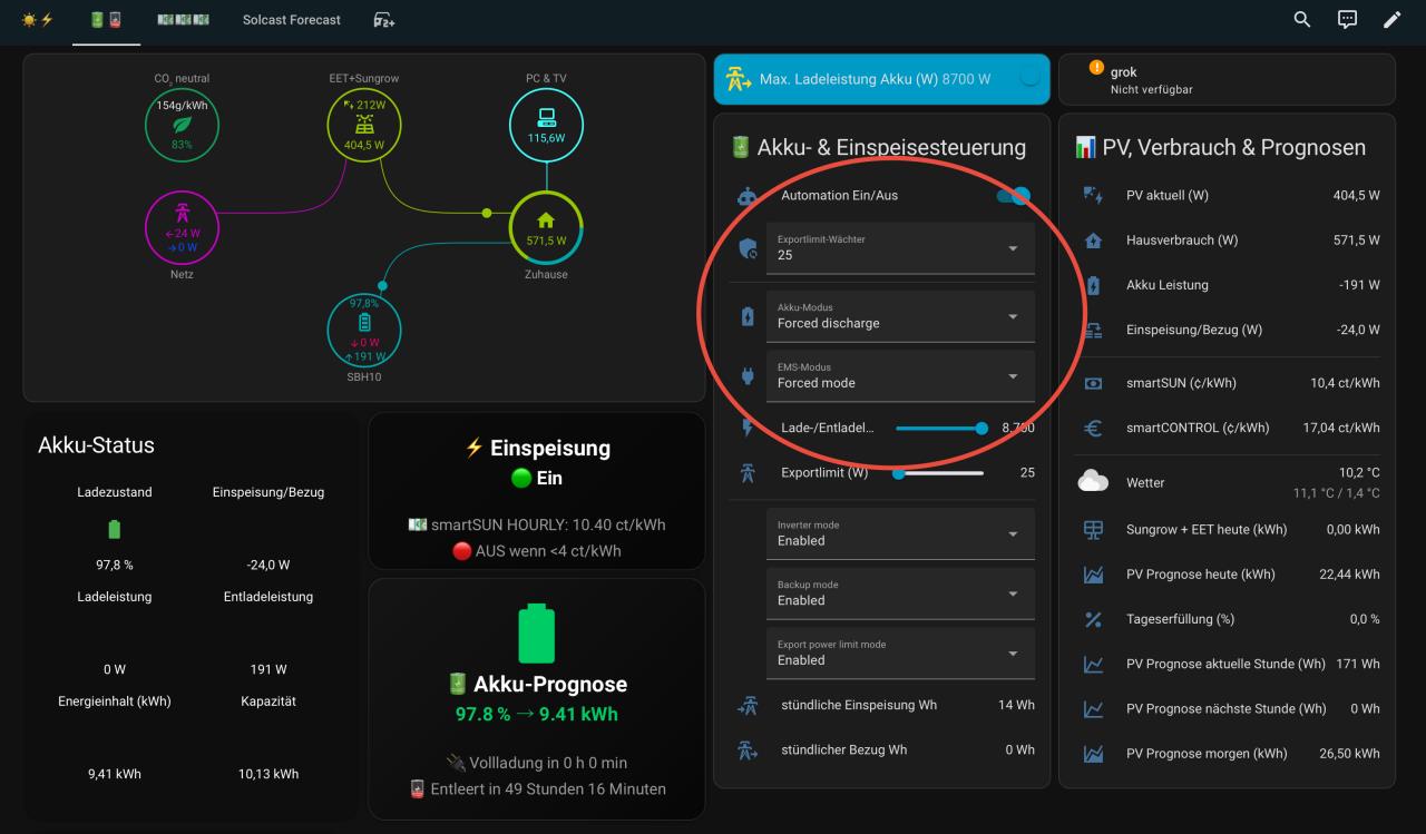 Ich versuche es mit HA, klappt noch nicht zu 100% aber es geht in die Richtung wenn ich noch etwas dran arbeite. Erzwungene Entladung und Einspeiselimit wählbar zwischen 0 und 500W ![]() |
