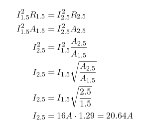 Vielleicht mal zurück zur Ausgangsfrage. Grundsätzlich ist gegen 16A auf 1.5mm² nichts einzuwänden (bei gedämmten Einbau auch mal nur 13A), nicht alle TAEVs sagen da das Selbe. Ausgehend von der gleichen Verlustleistung auf einer definierten Länge folgt: Bis 20A ist also alles thermisch im grünen Bereich (bei gedämmter Verlegung also gut 16A). Das Kriterium Spannungsabfall ist unkritischer, weil es direkt proportional 2.5/1.5=1.667 ist. |
