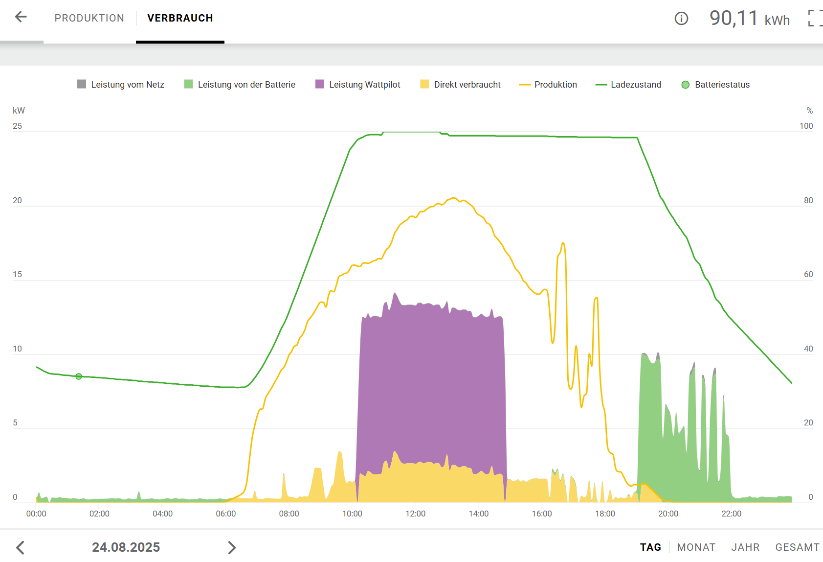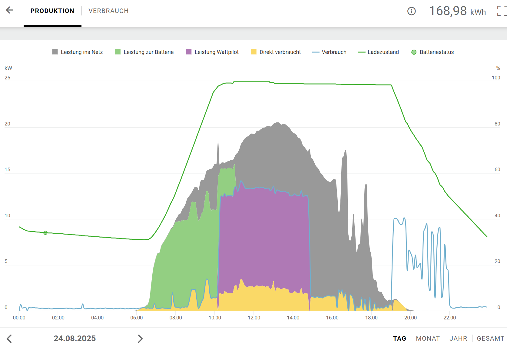 Unsere Anlagen sind in etwa gleich groß. Allerdings bei mir mit Batterie. Vergangener Sonntag: Produktion war 170 kWh Tagsüber 50 kWh mit 11 kW ins Auto geladen, davor die Batterie noch mit 32 kWh gefüllt. Am Abend war meine Tochter und ich noch in der Sauna ( 9 kW Ofen). Gesamtverbrauch an dem Tag: 90 kWh, davon 21 kWh aus der Batterie Netzbezug vom Netzbetreiber: Gesamtbezug: 0, 42 kWh, Leistungsspitze: 0,28 kW Vom Netzbetreiber: |