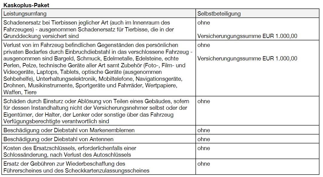 Hallo liebe MissT, anbei zur Orientierung: Annahmen: Haftflicht Stufe -3 inkl. Freischadenbonus, Alter über 23 Jahre. Kein SB in der Haftpflicht (auch nicht bei Fahranfängern) Kaskopluspaket, E-Pluspaket (beide ohne SB): Model Y 75kWh RWD, Listenneupreis 48.000 €, EZ 2023, 125 kW Dauerleistung: Haftpflicht, Kasko mit durchgehendem SB iHv. 500 €, Kleingläser: ohne SB, inkl. Kasko- und E-Plus-Paket sowie grober Fahrlässigkeit, Insassen und Assistance inkl. 7 Tage Leihwagen: 199,73 € monatlich (inkl. motorbez. Steuer iHv. 50,77 €) Model Y 75kWh Base, Listenneupreis 55.000 €, EZ 2023, 88 KW Dauerleistung: Haftpflicht, Kasko mit durchgehendem SB iHv. 500 €, Kleingläser: ohne SB, inkl. Kasko- und E-Plus-Paket sowie grober Fahrlässigkeit, Insassen und Assistance inkl. 7 Tage Leihwagen: 188,76 € monatlich (inkl. motorbez. Steuer iHv. 28,83 €) Model Y Long Range AWD 79kWh, Listenneupreis 56.000 €, EZ 2023, 153 kW Dauerleistung: Haftpflicht, Kasko mit durchgehendem SB iHv. 500 €, Kleingläser: ohne SB, inkl. Kasko- und E-Plus-Paket sowie grober Fahrlässigkeit, Insassen und Assistance inkl. 7 Tage Leihwagen: 226,72 € monatlich (inkl. motorbez. Steuer iHv. 63,97 €) Lg