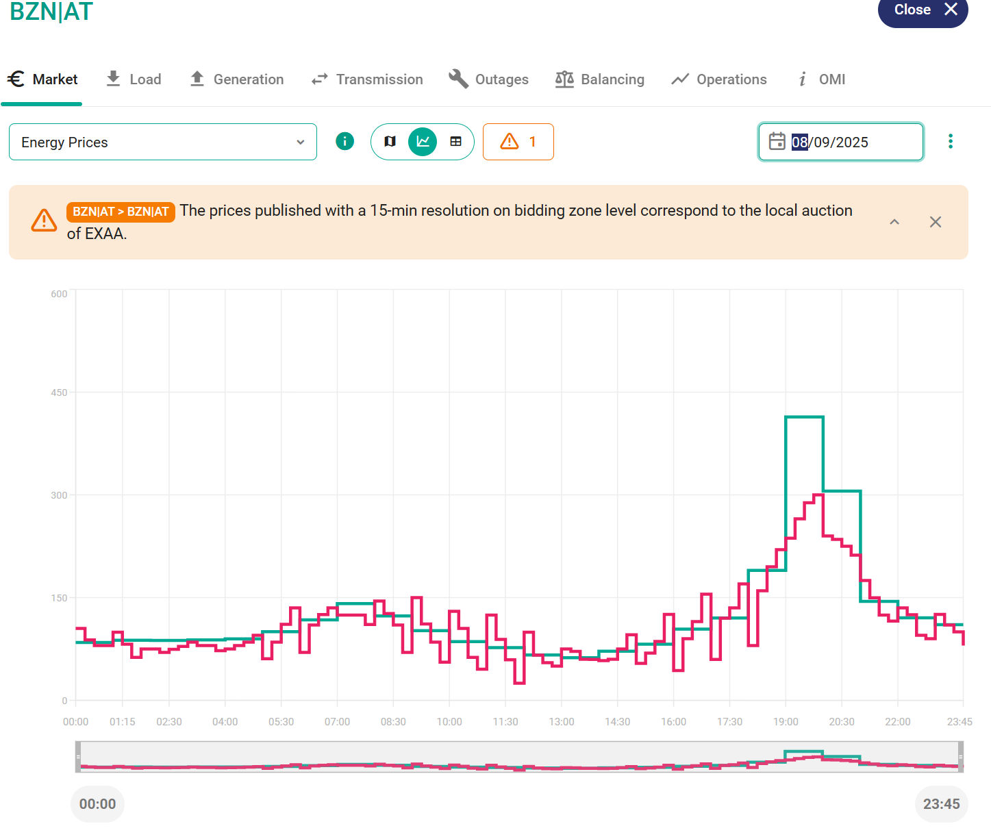 In Grün der EPEX Spot Preis auf Stundenbasis, in Rot die österr. Strombörse EXAA, die den Day Ahead in 15min handelt.