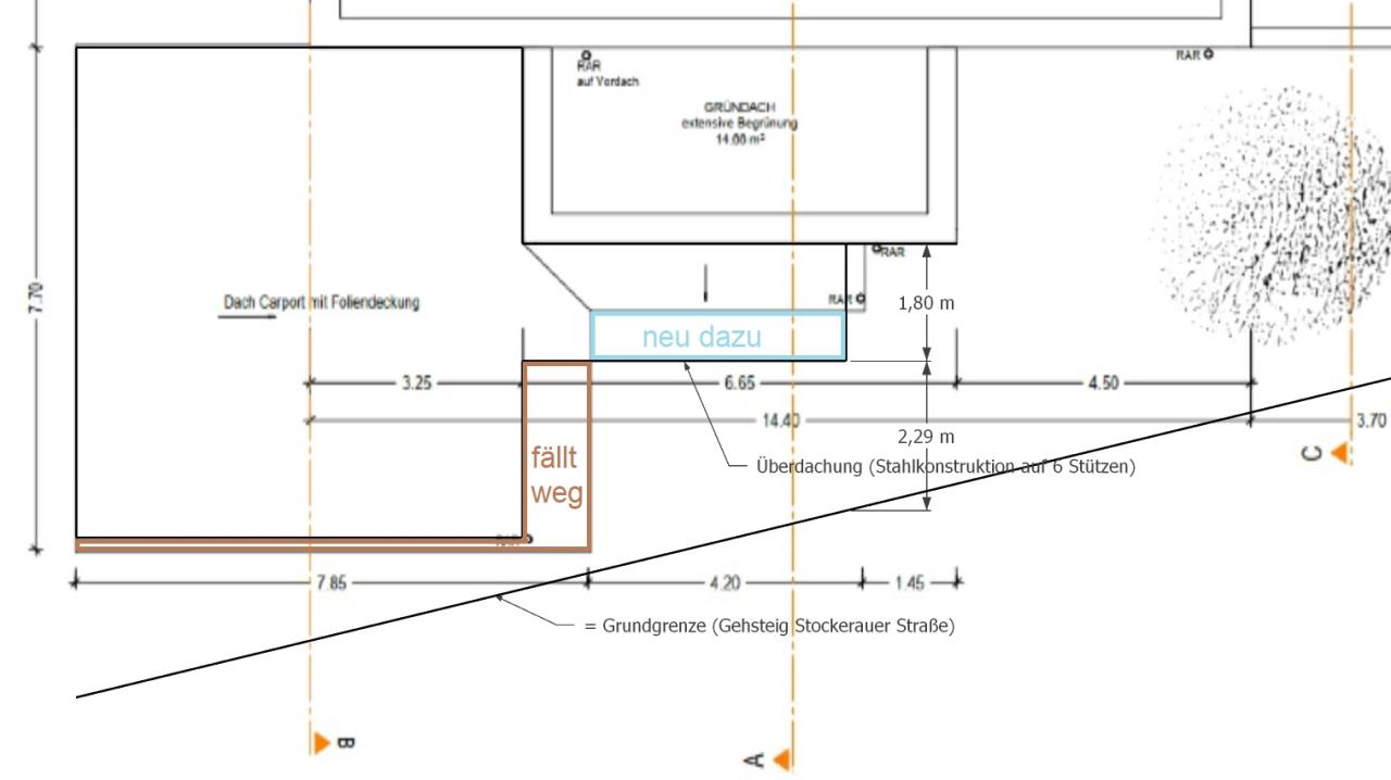 Wir wollen ein Stahl Carport errichten lassen und haben dazu bereits ein passendes Angebot von der Firma Ofentau vorliegen. Obwohl damals bereits mit eingereicht, brauchen wir laut Gemeinde trotzdem wieder einen befugten Planverfasser (Dachfläche ändert sich etwas, siehe Skizze) und auch einen Bauführer (Statik kommt zwar vom Stahlbauer, aber es geht anscheinend va um die Beeinträchtigung vom befahrbaren Stahlbeton Keller, über dessen Wänden zwei der Steher montiert wären).
