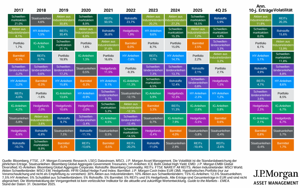 Die Assetklasse mit dem höchsten annualisierten 10Y-Ertrag (11,9% p.a.) waren per Ende 2025 Aktien aus Industrieländern - dies allerdings mit einem Risiko (= Standardabweichung) von 13,9% p.a.