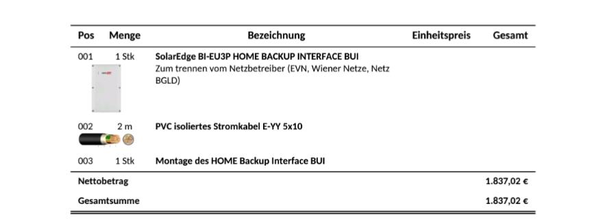 - ACHTUNG: Steht zwar im Angebotstext drinnen aber man sieht es hier nirgends. OHNE einem zusätzlichen BACKUP-Interface (kann man jederzeit nachrüsten) ist das derzeitige Angebot NICHT "Blackoutfähig / Ersatzstromfähig / Notstromfähig / Inselfähig" welcher Text auch immer dir am Besten gefällt :o)