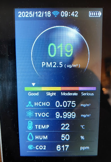 Ich habe auch keine KWL KWL [Kontrollierte Wohnraumlüftung]. Meine Frau bäckt gerade Kekse und es riecht wunderbar im ganzen Erdgeschoß. Der TVOC ist im nicht mehr messbaren Bereich und der HCOV ist auch zu hoch. Mit einer KWL KWL [Kontrollierte Wohnraumlüftung] würde das sicher nicht passieren. |