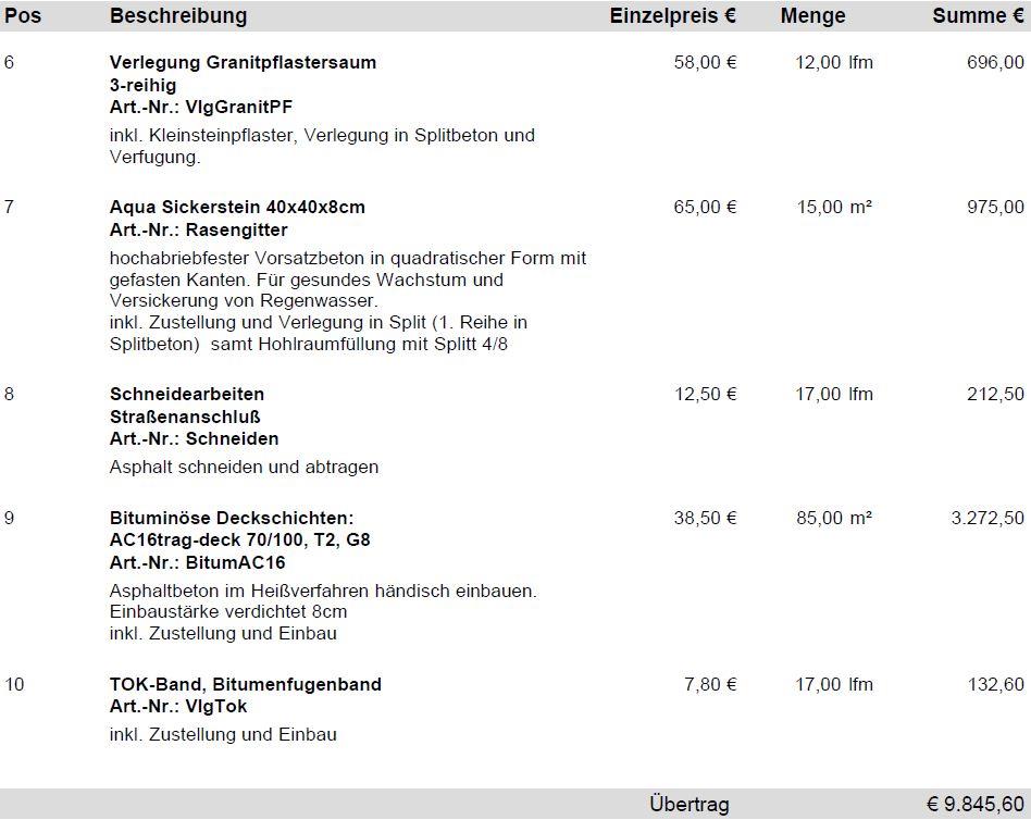 Hallo, Wir haben unser erstes Angebot für die Asphaltierung unserer Einfahrt erhalten. Mich würde interessieren was ihr zu dem Angebot sagt? Lt. Forum hier sind die Baustelleneinrichtungskosten VIEL zu hoch. Bin auf eure Antworten gespannt. Noch zur Info, die Baustelle ist in der Steiermark, Fürstenfeld. Lg. Maxi |