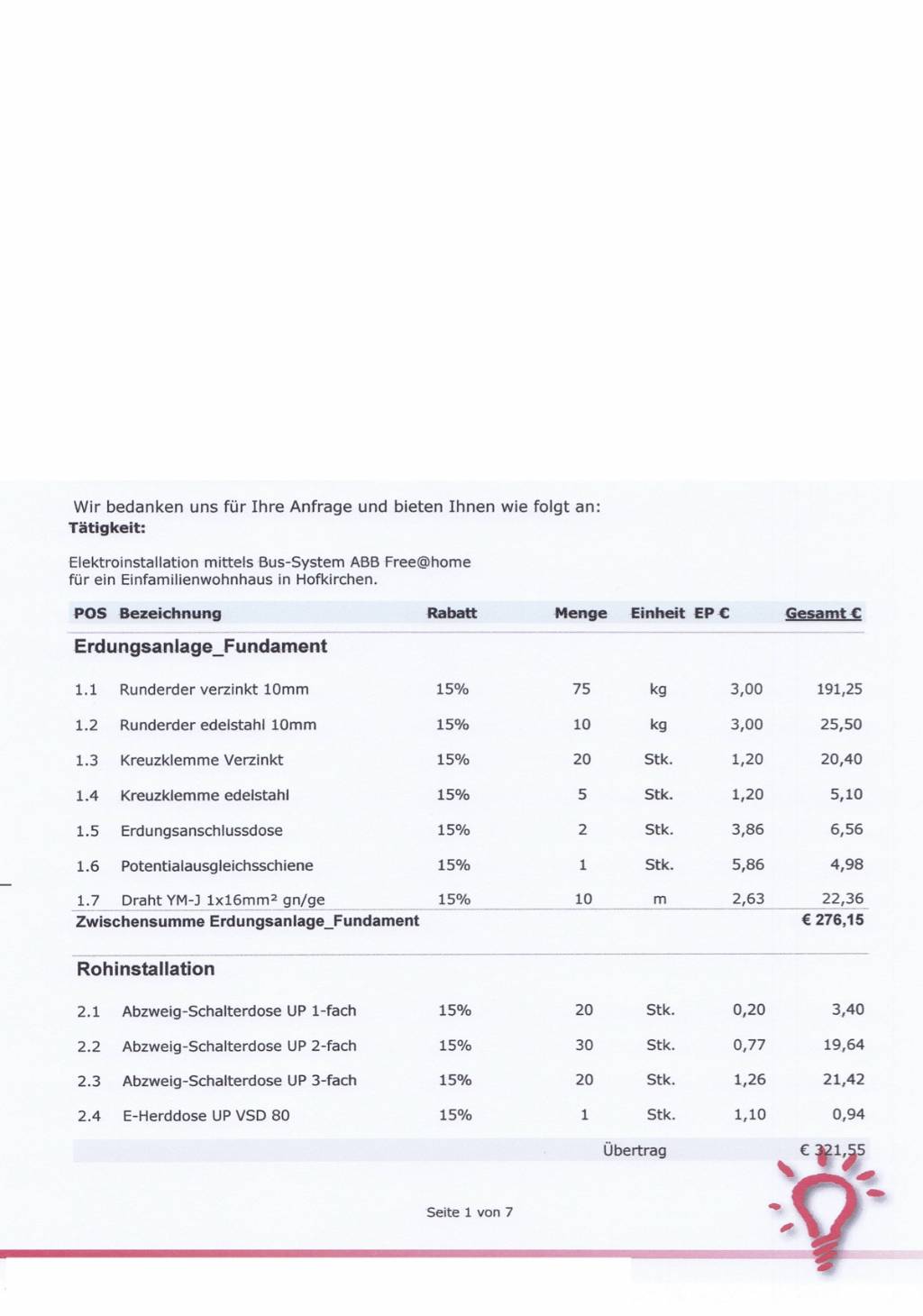 Wo seht ihr hier noch Verhandlungspotenzial? Sind das übliche Preise oder ist er doch preislich etwas überhöht? Geht bei Elektrikern auch etwas "steuerschonend"?