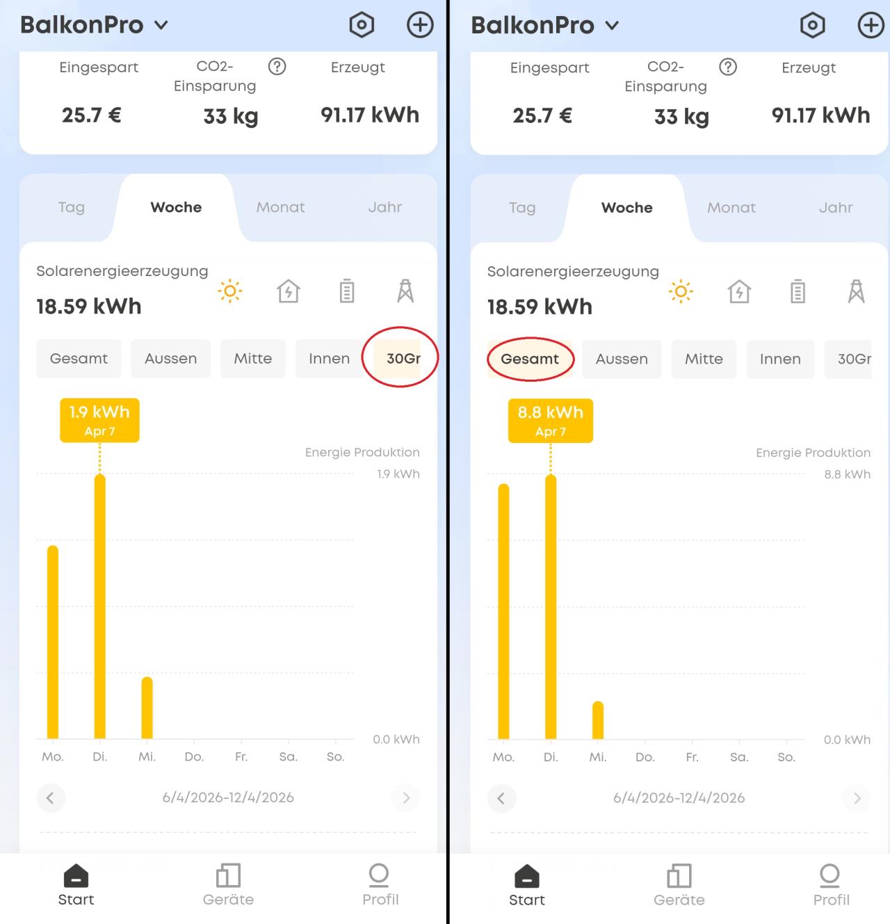 Ertragswerte des verschatteten Paneel im vergleich zum gesamtertrag ( Montag/Dienstag/Mittwoch) - hier hat alles funktioniert und das paneel "funktioniert"