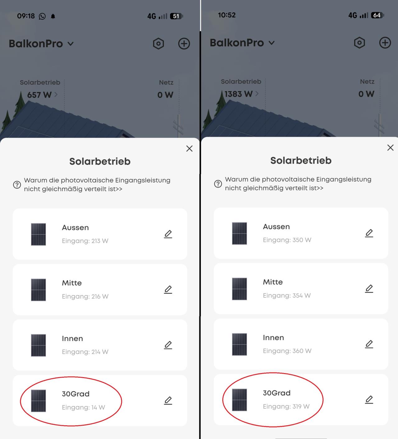 Die Problematik: Eines der Module ("30Grad") ist baubedingt im unteren Drittel permanent teilverschattet (es ist leicht unter die Kante der anderen Paneele geschoben). Das Verhalten des MPP-Trackers ist völlig unvorhersehbar und gleicht einem Glücksspiel: