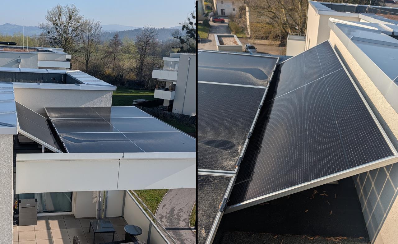 Schade. Denn die zwei waagrechten Module würden eine gewisse Neigung gut vertragen, damit der Regen zumindest ein bisschen abwaschen helfen kann. Bei Ausführung <5° werden sie halt ziemlich arg verschmutzen.