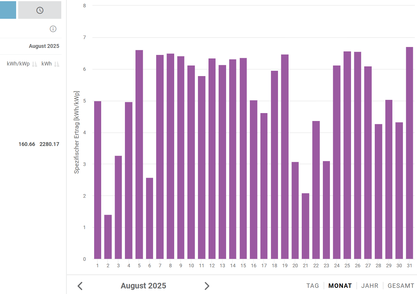 Diesmal war Kärnten vorne 14,14 kWp kWp [kWpeak, Spitzenleistung] Süddach, 2280 kWh Ertrag, 160,66 kWh/kWp 15 von 31 Tagen waren über 6 kWh/kWp Bester Tag: 31. August: 6,70 kWh/kWp |