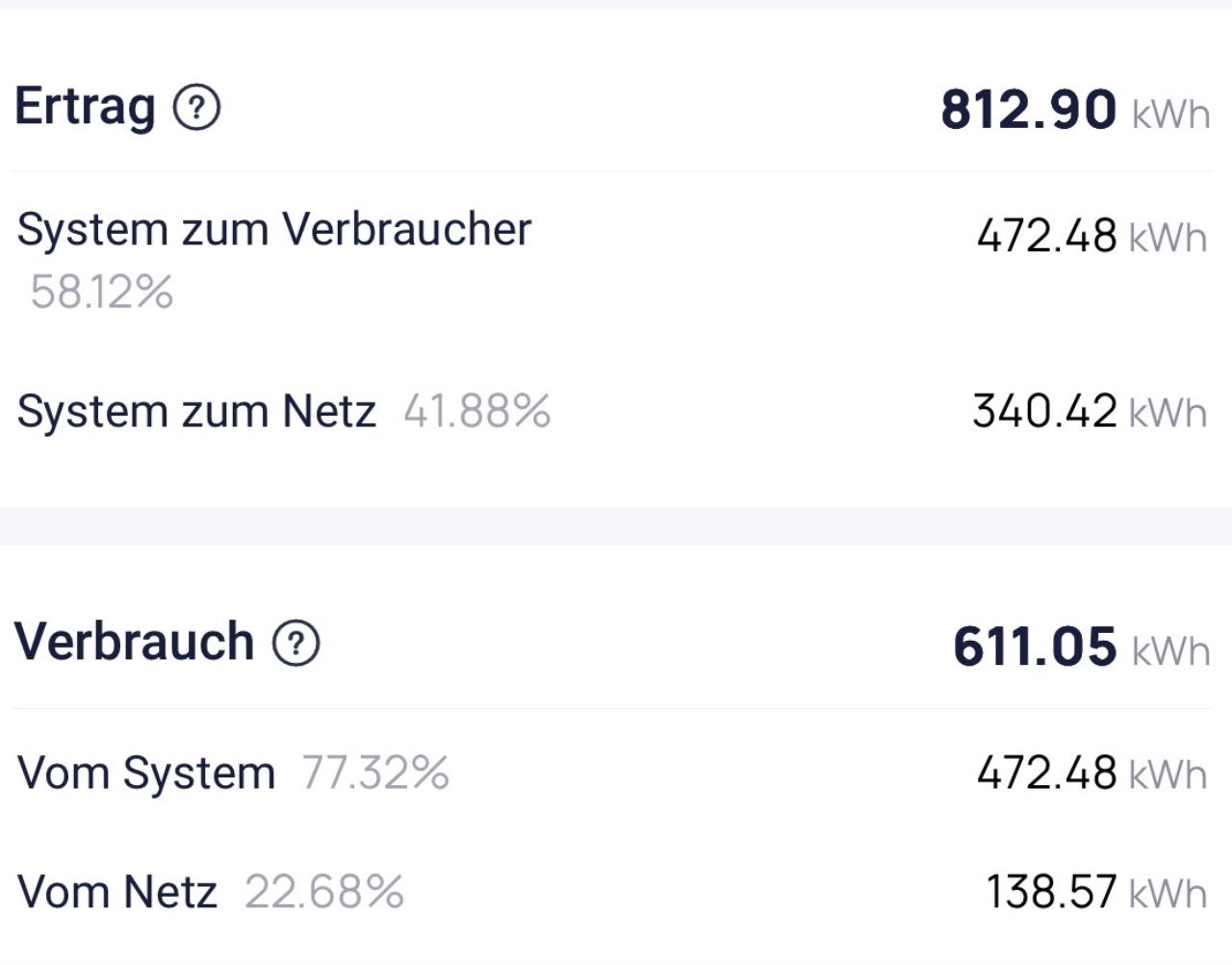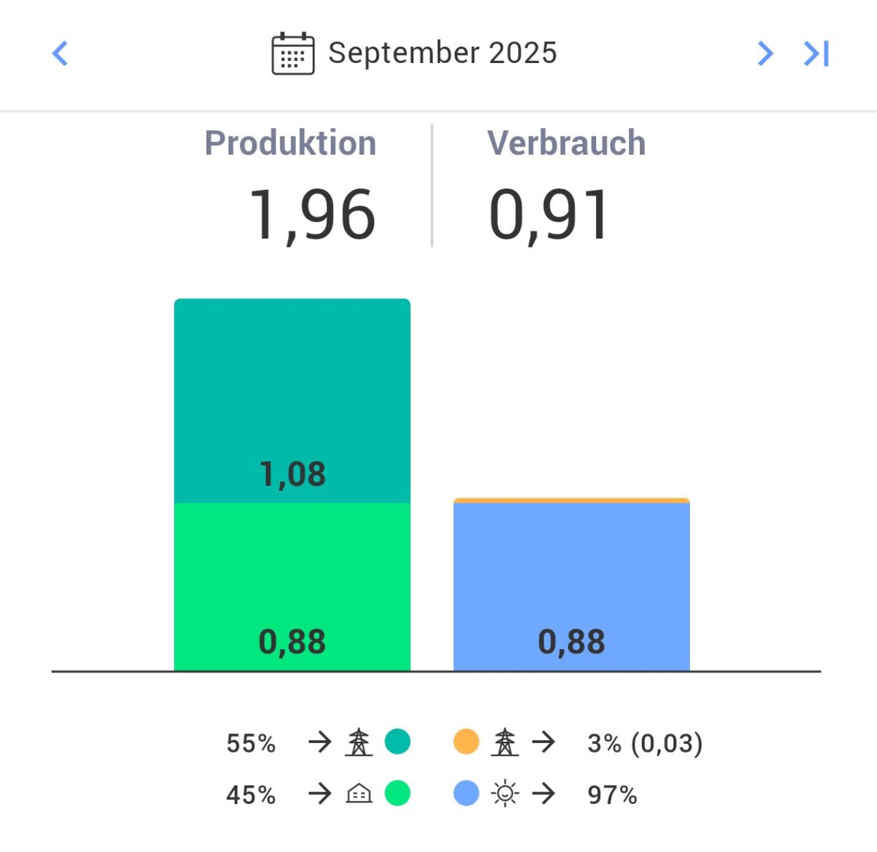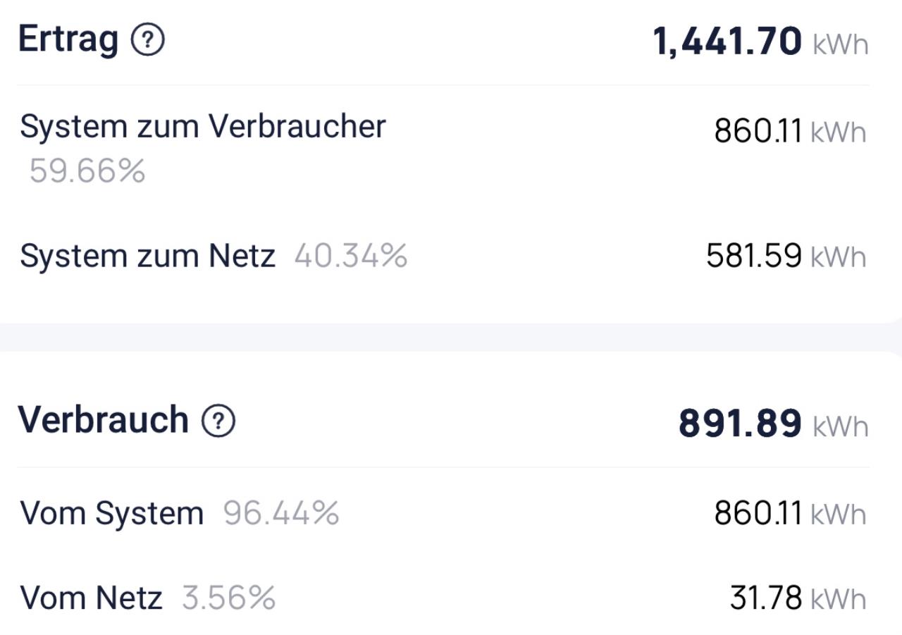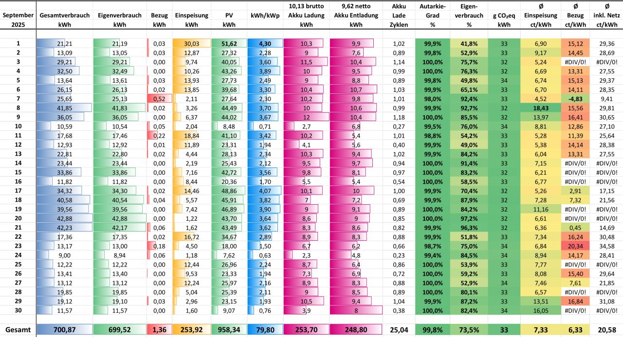 September 2025 Gesamtproduktion 12,01kWp: 958,34kWh -->79,8kWh/kWp Eingespeist: 253,92kWh Eigenverbrauch: 699,52kWh In Akku: 253,7kWh Aus Akku: 248,8kWh (1,9% Verlust, 25,04 Ladezyklen) Netzbezug: 1,36kWh Eigenverbrauch: 73,5% Autarkie: 99,8% |