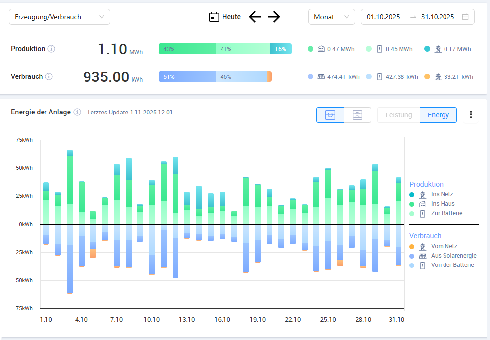 Oktober 2025 südlich von Graz 12,92kWp - 1/3 SO, 2/3 SW, Satteldach 45° Solaredge SE10K + 23kWh Speicher Produktion: 1.100 kWh / 85 kWh/kWp Verbrauch: 935 kWh Netzbezug: 29,46 kWh (lt. Netzbetreiber) Autarkie ca. 97% (WP + 2 E-Autos + Haushalt) |