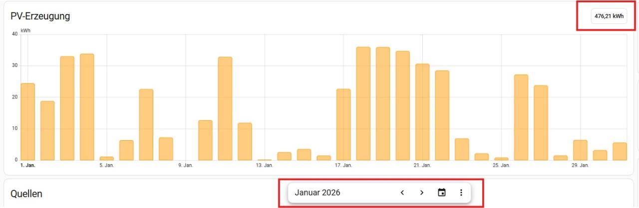 Geografisch korrekt. Anbei das Home Assistant Energiedashboard Jan. 2026 über die Tageserträge für jene, die es zum Vergleichen interessiert. |