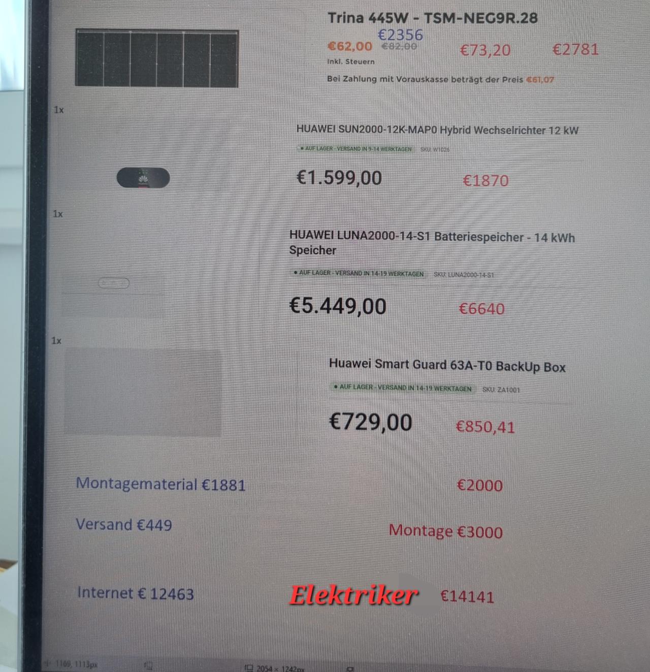 17kwp 14kw Speicher Wechselrichter smartguard Montagematerial und Montage 17000€ im Internet würde es 1600€ weniger kosten