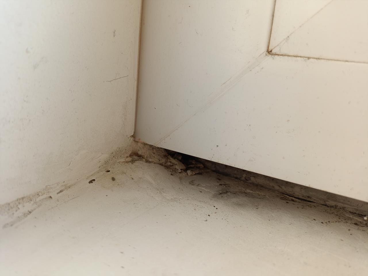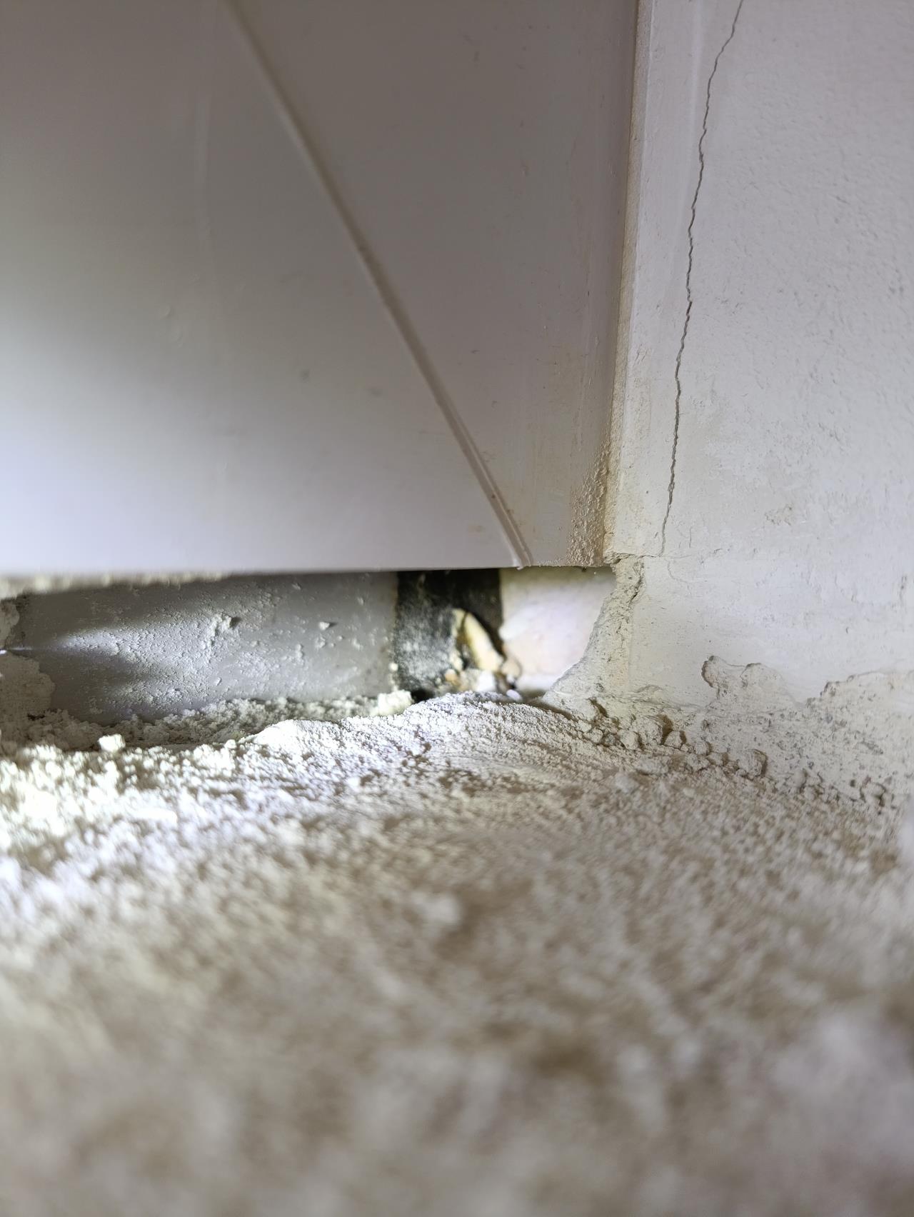 Auch kann ich in der rechten Eck (vorletztes Bild) mit dem Finger vor Fenster direkt in ein großes Loch rein und bis zur Wand durch. Der Putz war dort nur lose drinnen. Man spürt am Fenster aber auch irgendeine Art von weicher Ebene und ein Kompriband.