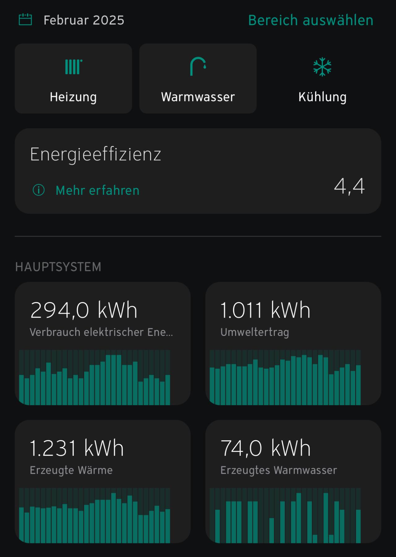 Feb 25 (LWWP): Elektrisch: 294 kWh WW: 74 kWh Heizen: 1231 kWh Summe: 1305 kWh Eff: 4,4 |
