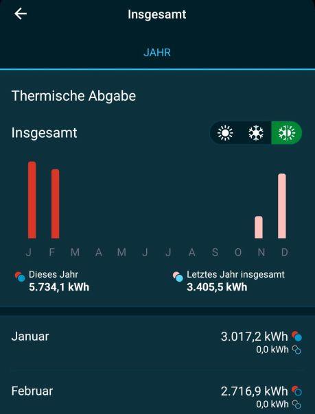 Teilgedämmter Altbau (Gasheizung flog raus, ab November Heizung mit Split-Klima). Jän bis Februar (Raumtemperatur ~23°): Stromverbrauch: 1064,2 kWh Wärmeabgabe: 5734,1 kWh SCOP: 5,4 |