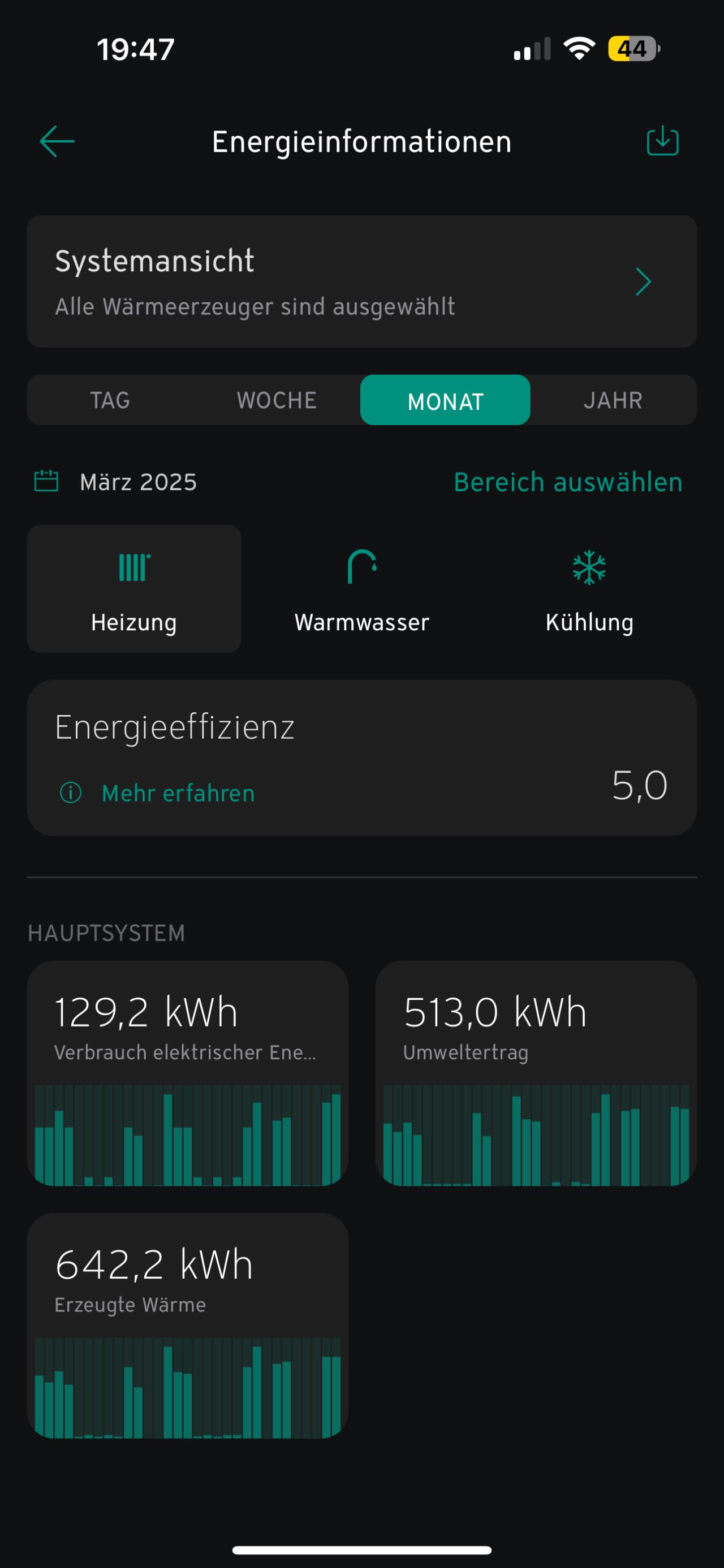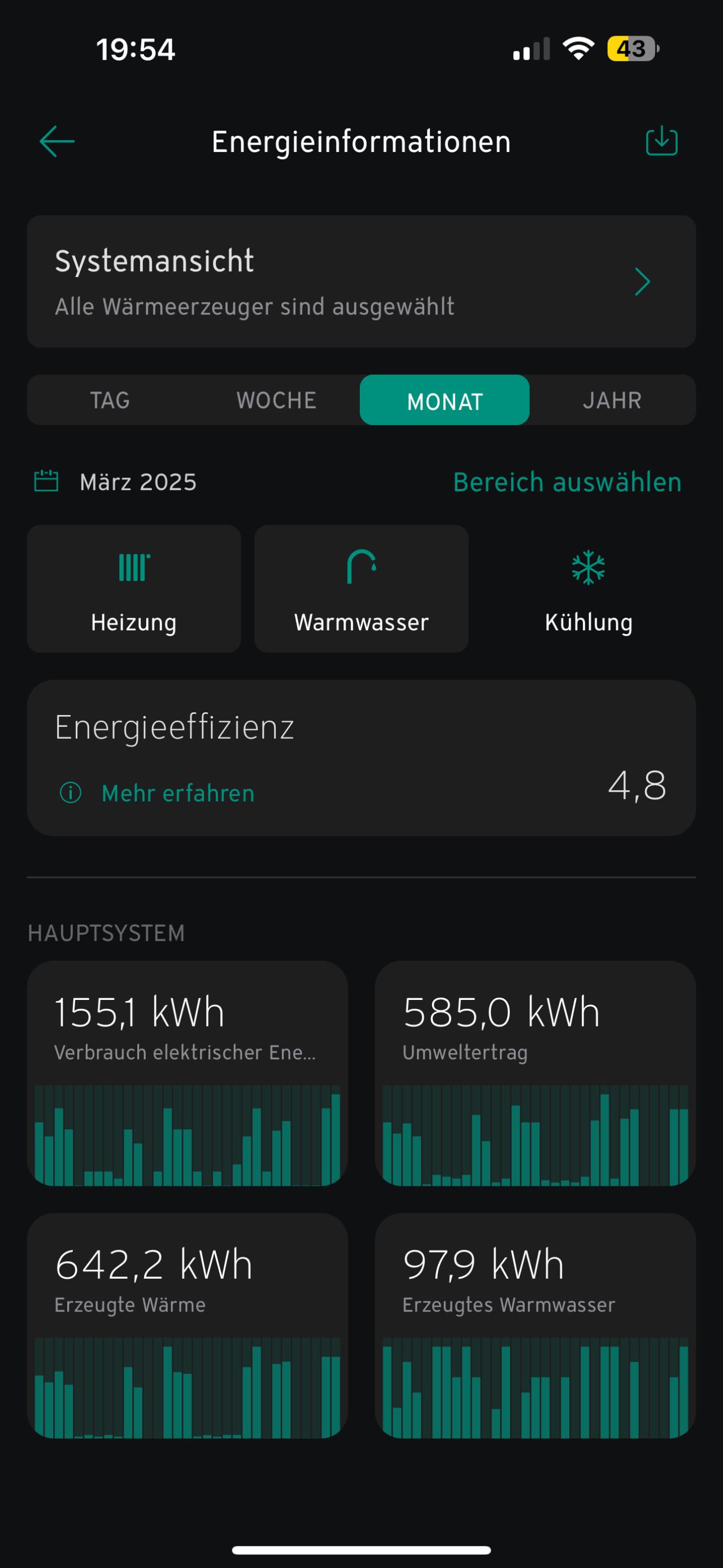 Ich kann nicht beurteilen, ob die Angabe in der App korrekt ist oder nicht. Jedenfalls kann der Stromverbrauch nicht viel daneben liegen, da ich ja den Gesamtstromverbrauch kenne, die PV Erzeugung und den Netzbezug. Auch habe ich nicht durch geheizt sondern im März vor allem nur tagsüber (PV Strom genutzt -> Vorlauf angehoben). Warmwasserbedarf war nicht täglich gegeben (47 Grad geheizt ->2x duschen = 40 Grad Rest. Reicht für eine Badewanne). Mir persönlich geht es eigentlich nur um den Stromverbrauch - die Effizienz ist zweitrangig (solange sie nicht taktet...). Evtl kann ja jemand mit Vaillant Setup bestätigen, ob die Arbeitszahlen gewürfelt sind oder passen. |