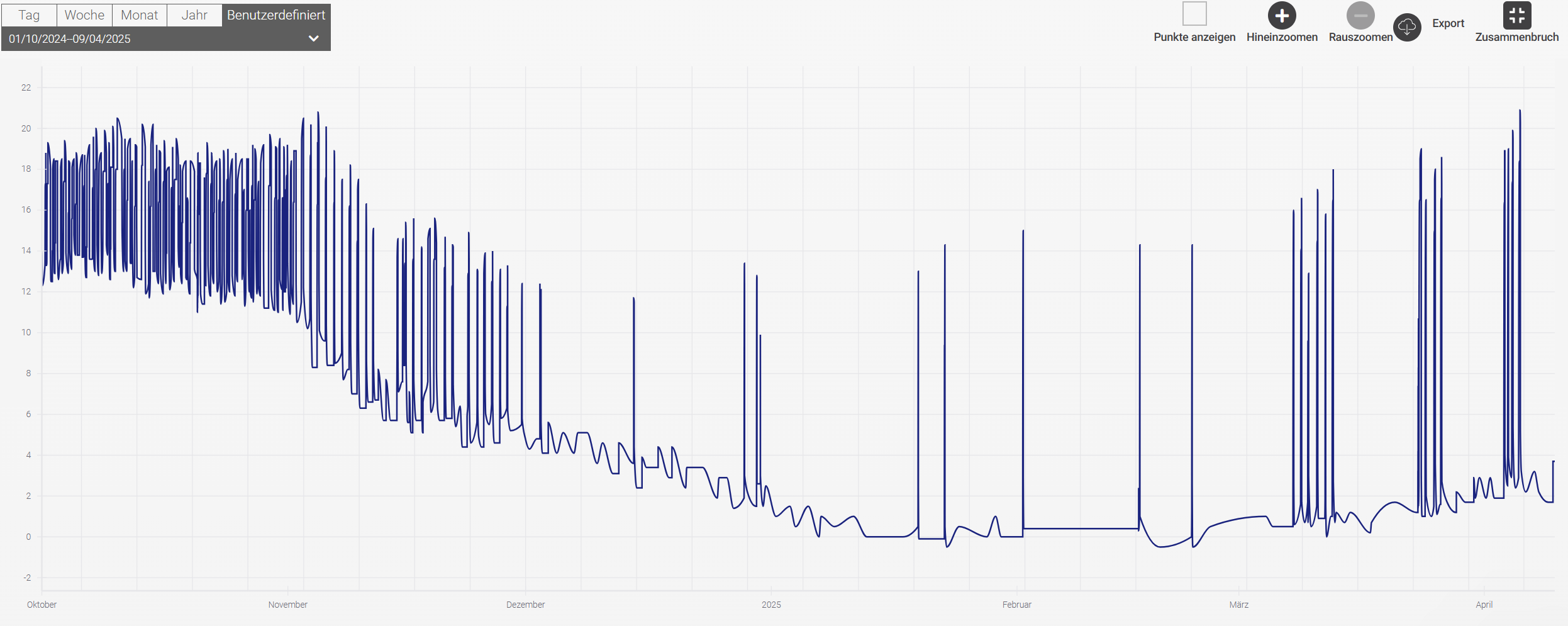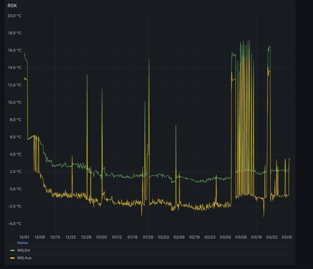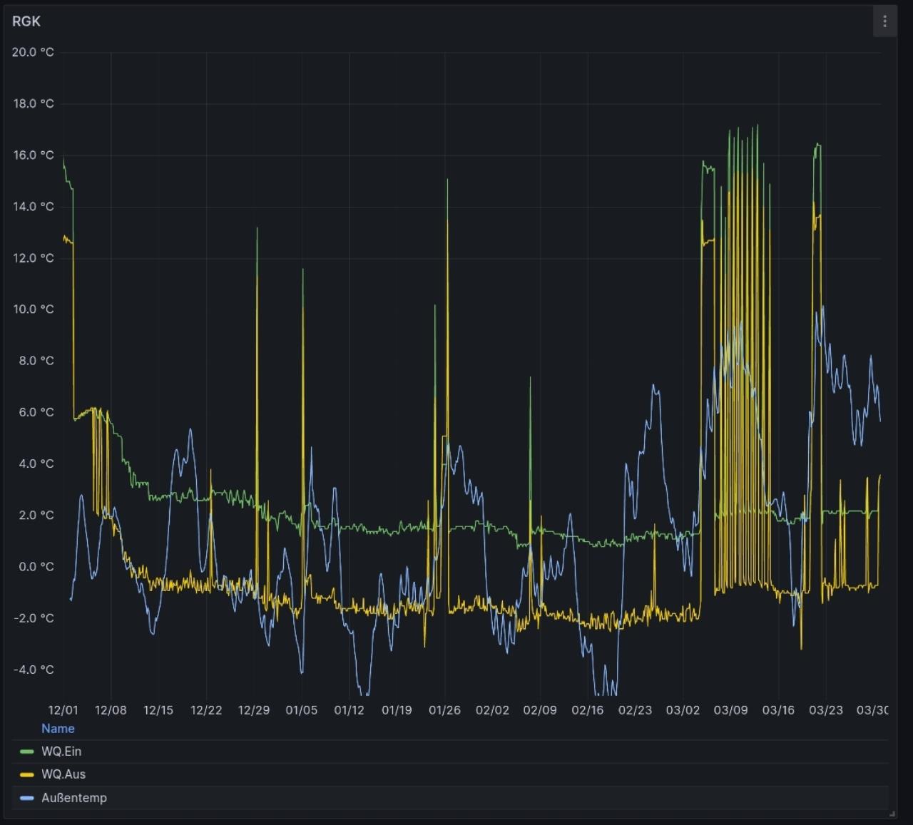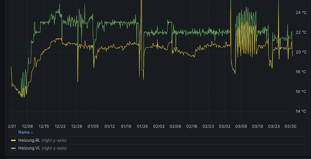 Einmal die WQ Temps ausgelesen über Modbus. Die Spikes sind Takte und die WQ Pumpe stand. Habe die Pumpe inzwischen auch im Standby minimal laufen um die Temps besser monitoren zu können. Hier einmal überlagert mit der Außentemperatur geliefert von der Wetterstation. Und die VL VL [Vorlauf] Temps Die Werte vor Dezember lasse ich bewusst raus, da bis ende November der Estrich ausgeheizt wurde. Der Anstieg der WQ Temps könnte möglicherweise an den steigenden Außentemperaturen liegen und an der höheren Sonneneinstrahlung. Wir haben große Fensterfronten gegen Süden die aktuell auch nicht verschattet werden. Die Räume heizen sich schon schnell stark über VL VL [Vorlauf] auf seit die Sonne wieder etwas raus kommt. Bei Interesse kann ich auch weitere Graphen liefern. Ich habe so ziemlich alle Werte welche die Nibe per Modbus liefert (und noch ein paar mehr) lückenlos aufgezeichnet. |