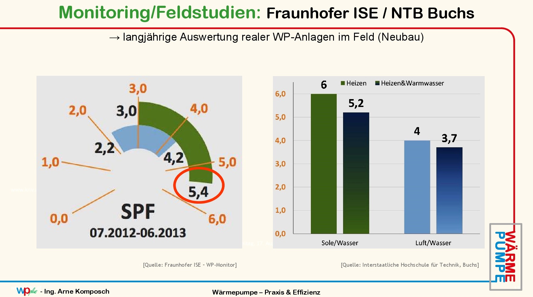 ja, der faden hat leider seinen sinn völlig verloren seit hier äpfel mit birnen mit kirschen verglichen werden... wenn man weiterhin vergleichen will muß man sich auf Systemgrenze JAZ JAZ [Jahresarbeitszahl] 0 einigen, das zeigen die geräte alle an... regler, standby, kompressorheizung, hilfsantriebe mißt kein einziger hersteller mit. es gibt hier hydrauliken mit 1 umwälzpumpe und solche mit 4 umwälzpumpen. es gibt LWWP LWWP [Luft-Wasser-Würmepumpe] mit begleitheizungen direktelektrisch im standard, abtautasse, abflußrohr die werden auch nirgends gezählt. ja, und dann gibt es 2 goldene ausnahmen, die zählen sogar die abtauenergie im wmz wieder runter, weil sie ja wieder aus dem haus rausgepumpt wird. bei den anderen wird die JAZ JAZ [Jahresarbeitszahl] dagegen umso besser jem ehr abgetaut wird. weil die wp von einem niedrigeren temperaturniveau wieder raufheizen darf... wer wissen will was real läuft schaut sich besser feldtests an, hier links älter aus Deutschland von Fraunhofer und rechts aktuell von der Schweizer Hochschule Technik Buchs... blau luftgekoppelt, grün erdgekoppelt... beides ausschließlich neubauten, der linke balken ist jeweils reiner heizbetrieb, der rechte heizen&warmwasser... es sollte keine wärmepumpe ohne echtem stromzähler verbaut werden. dieser kostet vielleicht 30,- € dann könnte man hausgröße/standort/strombedarf vergleichen; die endenergie einer wp-anlage.