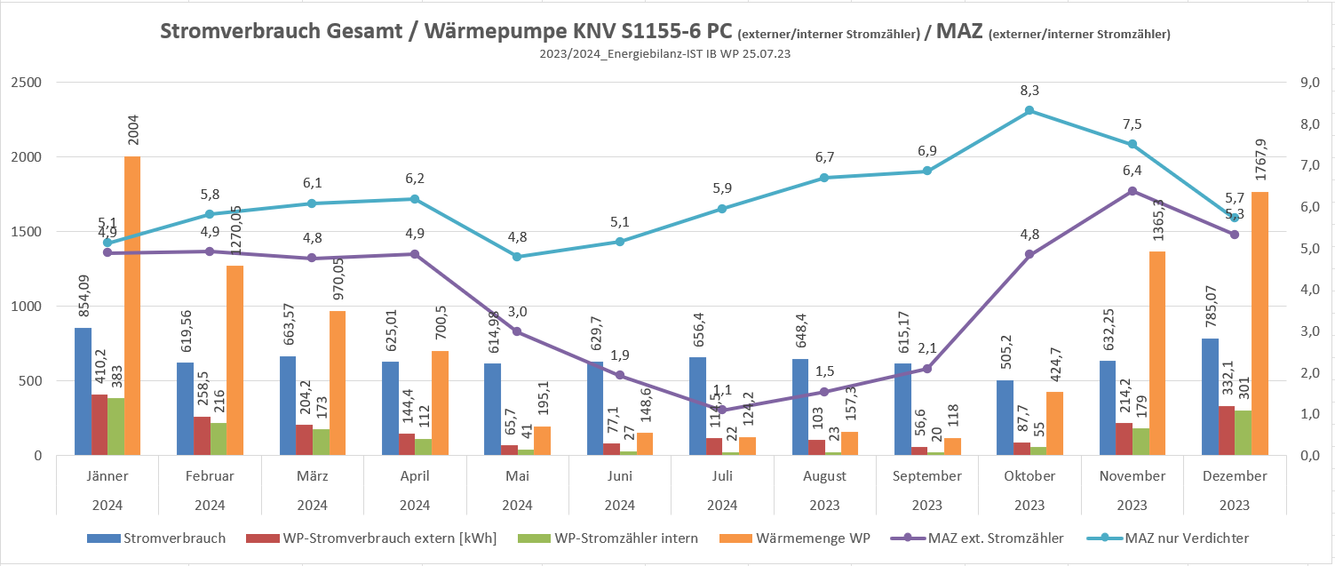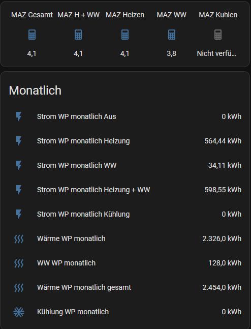 Guten Morgen. Auch ich hab heute mal auf den Stromzähler geschaut: Seit Semptember 2024 bis heute Früh hab ich bei der WP WP [Wärmepumpe] 1477 kWh Strom verbraucht. Der Wärmemengenzähler der KNV S1156-8 sagt: