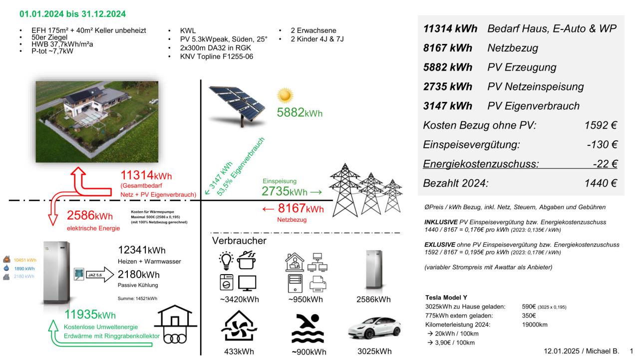 Meine Bilanz für 2024 mit RGK RGK [Ringgrabenkollektor] 300m DA40, Sole bis zu -0,7Ein/-3,8Aus runter. 9314kWh Wärme (Hz. 7815 + WW 1499) 1852kWh Strom inkl. allem über externen Zwischenzähler gemessen JAZ 5,03 Zwischenstand Januar 1.1.-21.1.2025 (Sole-Ein bei etwas Last immer <0): 1334kWh Wärme (Hz. 1249 + WW 85) 278kWh Strom MAZ 4,8 Diesen Winter sind meine Soletemps etwas niedriger als letzten Winter. Damit sind keine Wunder zu erwarten, aber mit JAZ JAZ [Jahresarbeitszahl] um die 5,0 und 1850kWh bin ich nicht unzufrieden. Nur vom RGK RGK [Ringgrabenkollektor] - jetzt im 3. Betriebsjahr - hätte ich mehr erwartet. |