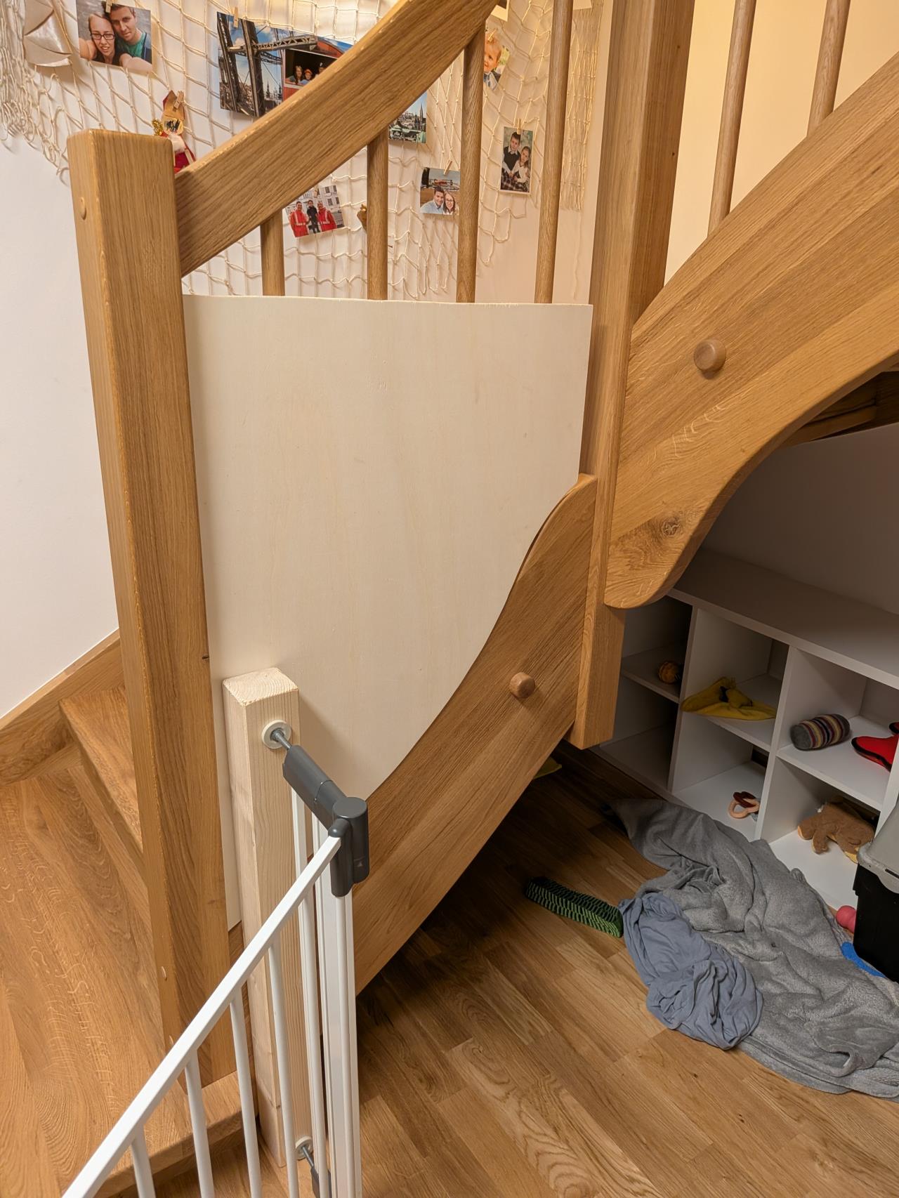 Unser Hund hat einen abgetrennten Bereich unter unseren Stiegen. Zwischen Mauer und Geländer ist der Bereich vorne mit einem Babygitter abgesichert, nur leider kann unser Wuffi durch das Geländer (gelb markierter Bereich im Foto) flüchten, da sein Kopf noch so klein ist.