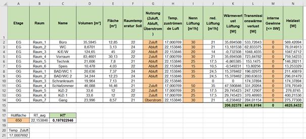 In der Übersicht werden dann die einzelnen Räume angezeigt, die Transmissionswärmeverluste und die Lüftungsverluste (Wärmeverlust Lüftung bei