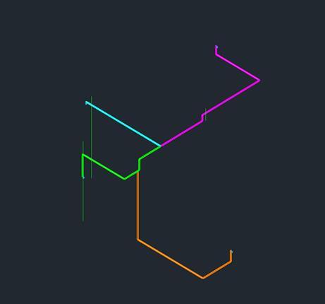 Die Wärmepumpe sitzt am Anfang des grünen Rohrs, über dem pinken Rohr befindet sich 1× FBH-HKV OG und 1× BKA-HKV OG, türkis ist 1× BKA-HKV EG und orange ist 1× FBH-HKV EG.