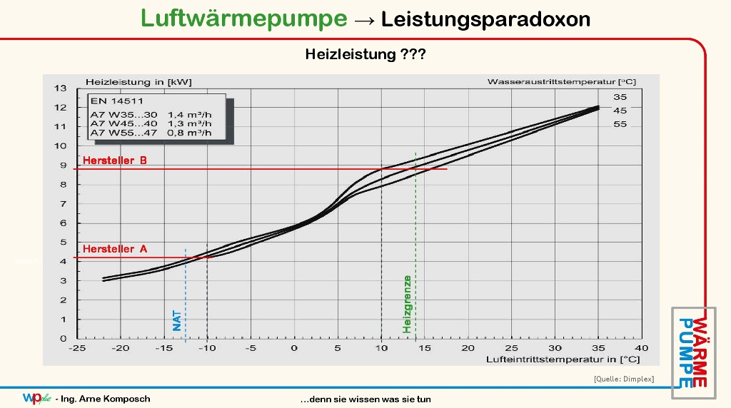 als ergebnis wäre der idente verdichter bei einem hersteller eine 4,5kw und beim anderen eine 9kw wärmepumpe. tatsächlich hat bei dem einen hersteller die 8kw wp mehr leistung als die 12kw wp beim anderen.