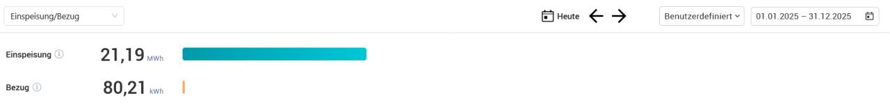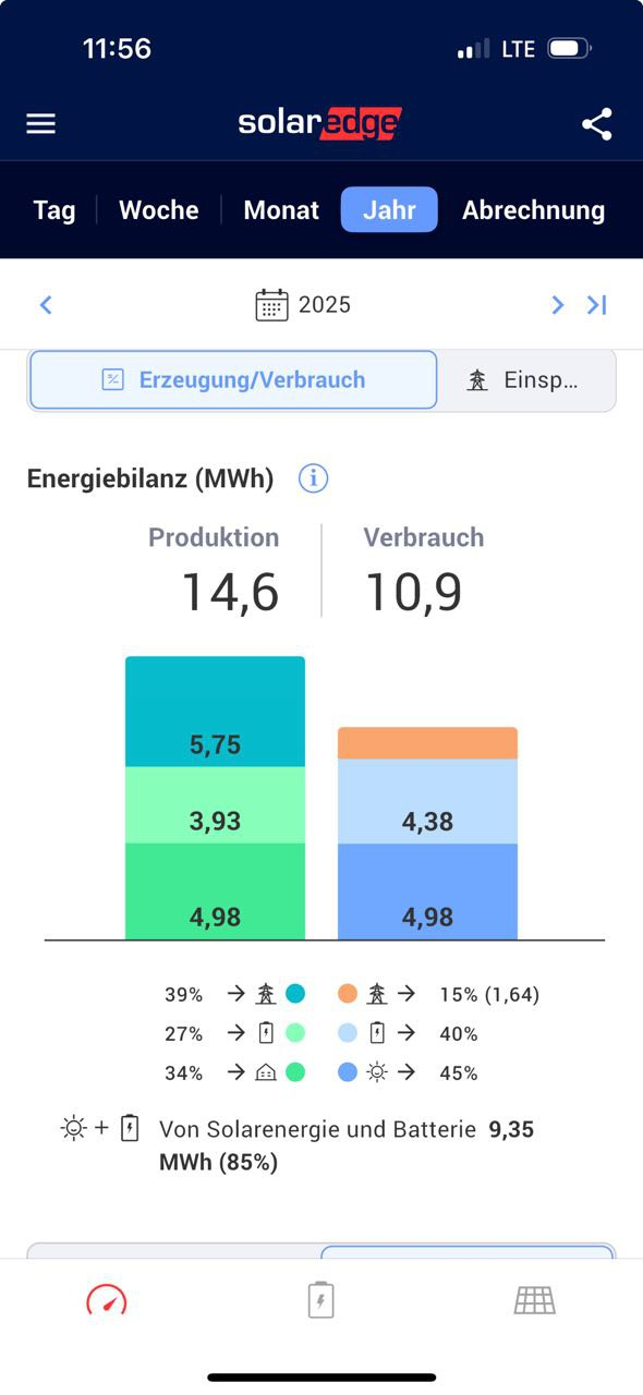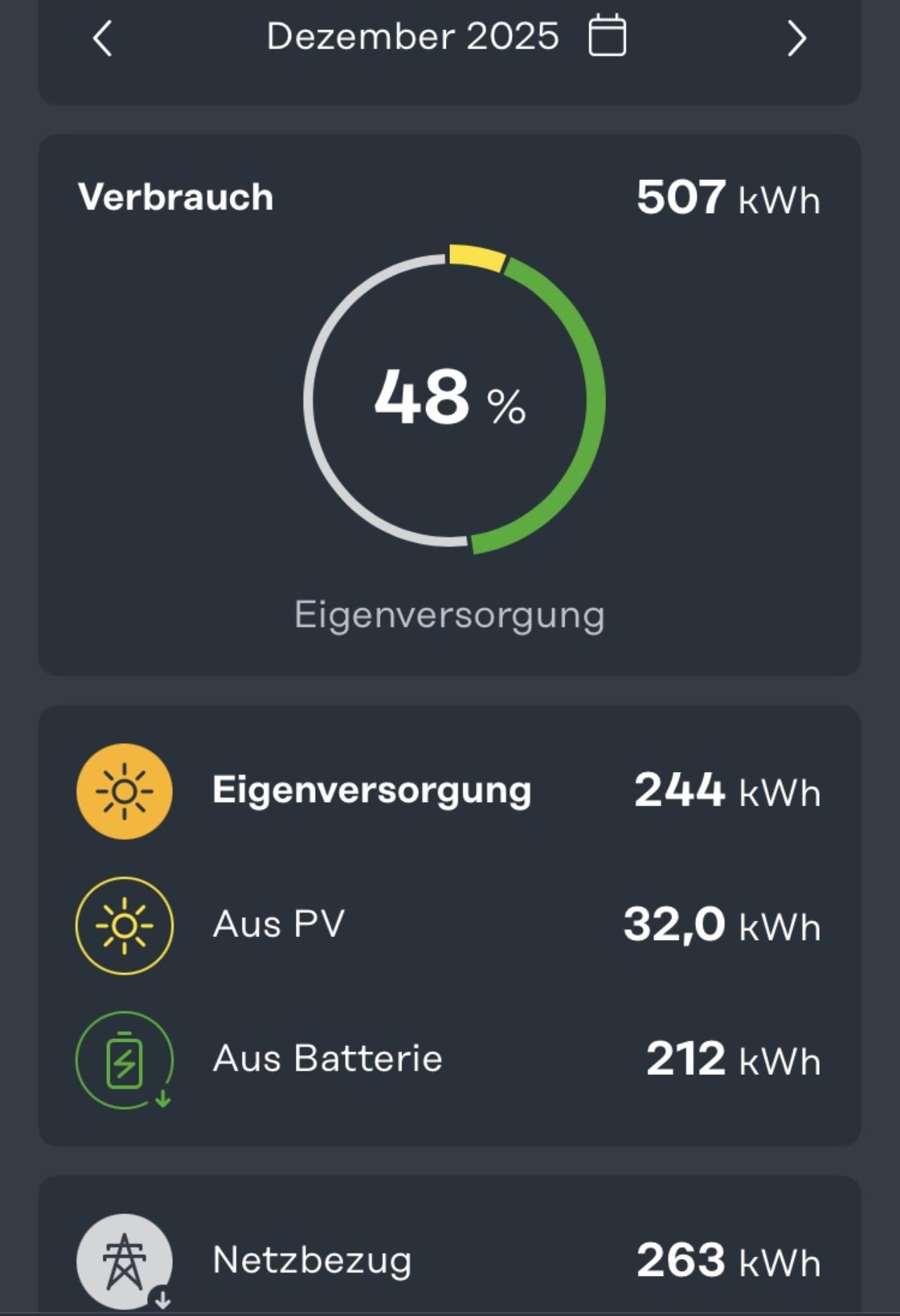 Bei uns in 2025: 7730kWh Gesamtverbrauch für Haushalt, WP, KWL, 1x E-Auto 10tkm. Zukauf 2370kWh, somit knapp unter 70% Autarkie. 5400kWh Eigenversorgung = 3400kWh direkt von PV + 2000kWh vom Speicher (201 Vollladungen). PV 16kWp OSO + SSW, teilweise Verschattungen, besonders im Winter. Dazu 10kWh Speicher. Als Vergleich: In 2024 hatte ich noch 30kWp für Eigenverbrauch zur Verfügung, inkl. meinem 2. Anlagenteil 14kWp NNO + WNW (dieser ist seit 2025 nun Volleinspeiser). 6150kWh Gesamtverbrauch HH, WP, KWL, E-Auto nur 2 Monate ab 11/2024. Aus PV+Speicher 4750kWh, Zukauf 1400kWh, Autarkie 77%. Interessanterweise kein so riesiger Unterschied mE. Zwar 1000kWh weniger Zukauf, aber auch nur 2 Monate E-Auto geladen. So wahnsinnig viel kommt im Winter von den schlechteren Dachflächen NNO+WNW halt nicht. |