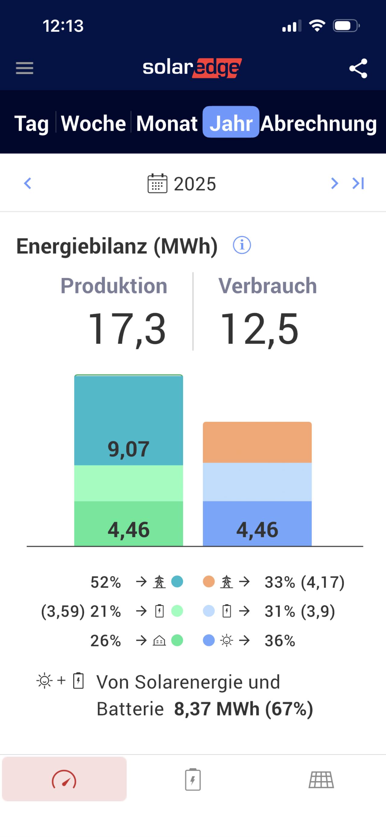 alles elektrifiziert 3 Personenhaushalt 2 E-Autos WP etc. Die Darstellung von Solaredge ist nicht akkurat wenn man die Batterie aus dem Netz ladet. Gesamtverbrauch: 10.990 kWh Netzbezug lt. Netzbetreiber: 2.271,11 kWh Ergibt eine Autarkie von 79,4% |