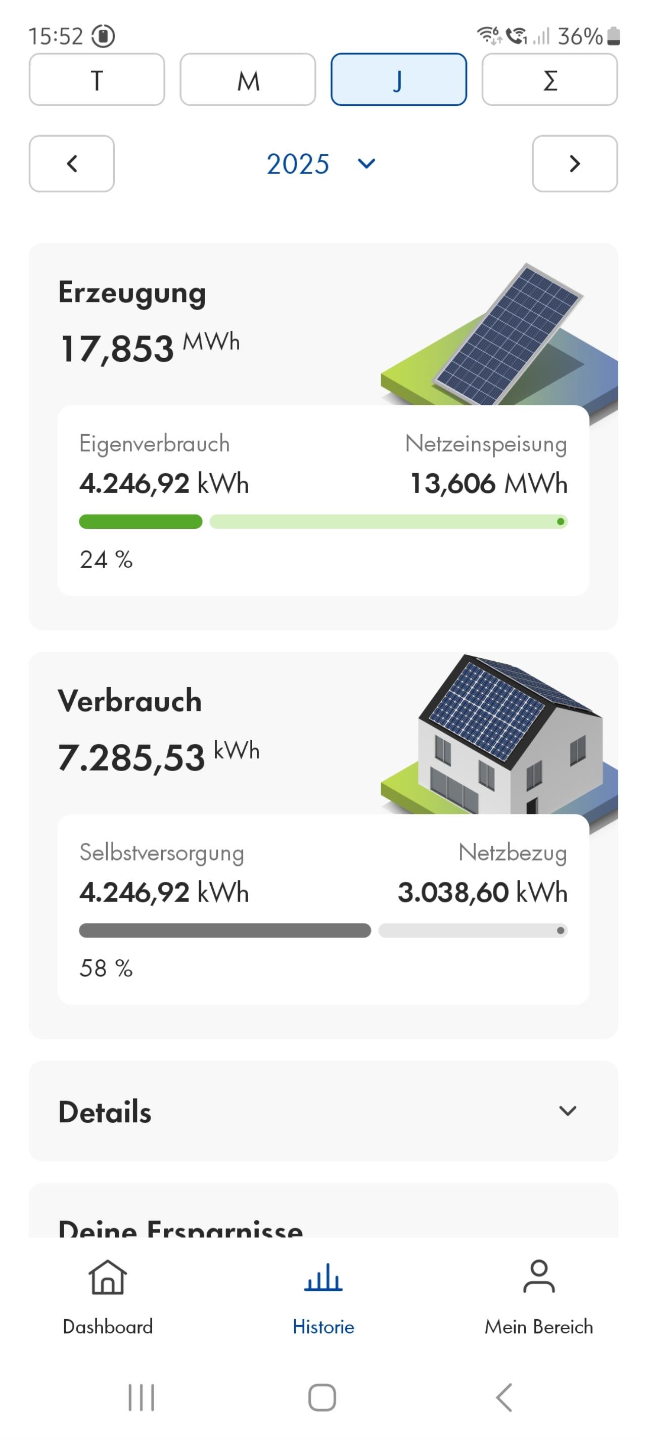 So sieht für 2025 bei uns aus. Region Bayern. WP, E- Auto mit 12k Kilometer, Pflanzenlampen meiner Frau ihrem Hobby, da gehen stündlich 700watt durch bei 11 Std am tag |