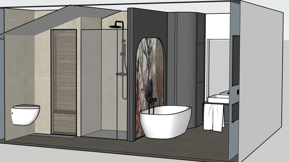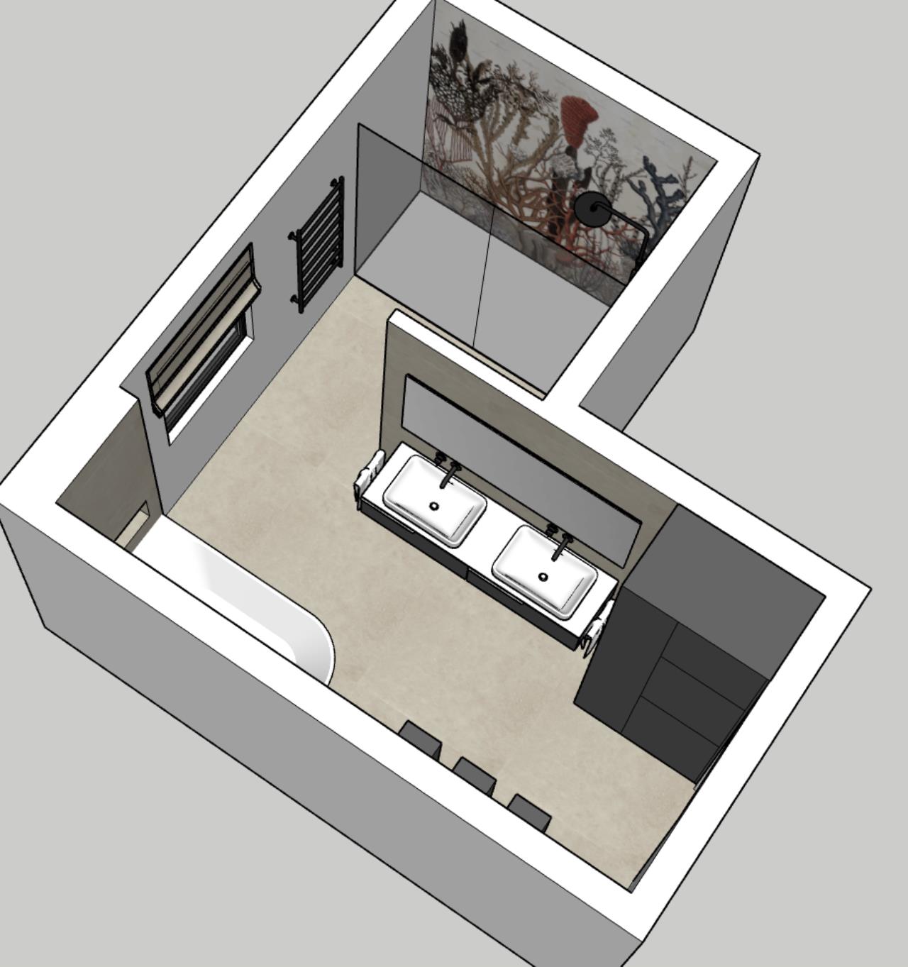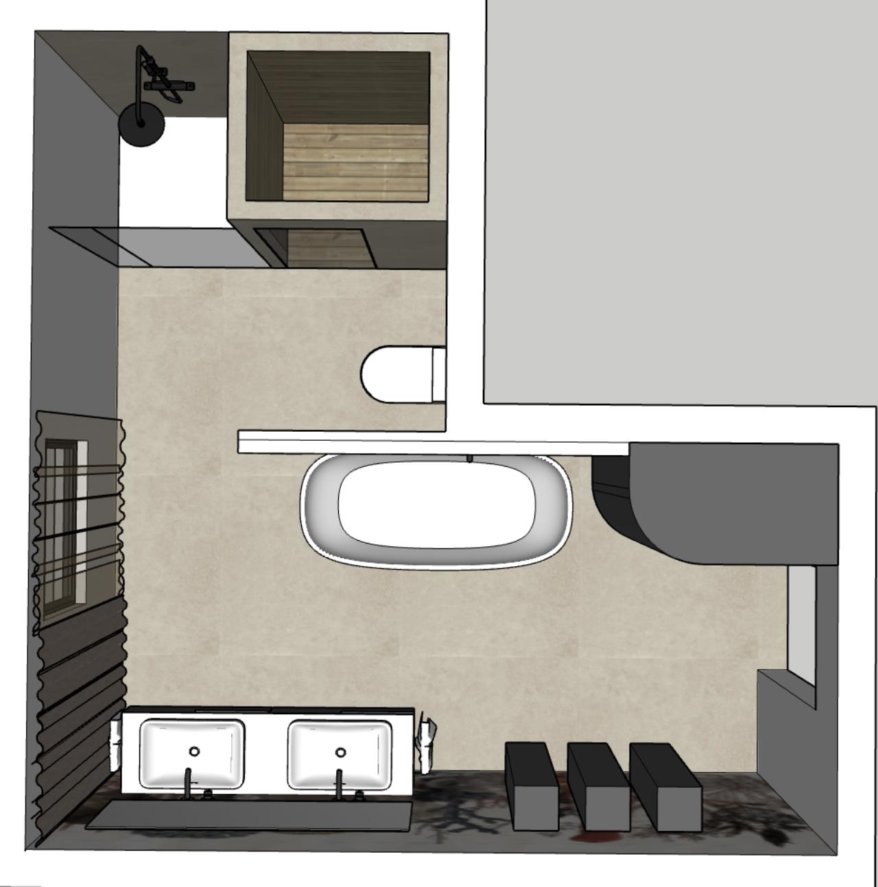 Hab mich ein wenig mit Sketchup gespielt. Ich bin auf folgendes Layout gekommen: Begehbare Dusche ganz hinten, dann WC, kleine Schamwand, dann Waschbecken, neben Waschbecken Hochschrank mit Regal und Waschmaschine/Trockner, gegenüber nette Kasterl und die Badewanne halb freistehend. Mir gefällts. Ist Luxus ;) LG |