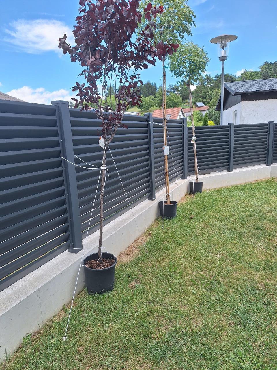 Da ihr die Bäume schon gekauft habt: Einsetzen und ausreichend gießen - viel hilft nicht immer viel, sondern kann je nach Bodenbeschaffenheit auch zu Staunässe führen. Im Topf müsst ihr sie bei der aktuellen Hitze sicher täglich gießen, da die Verdunstungsfläche der Blätter in keinem guten Verhältnis zur Größe des Wurzelballens steht.