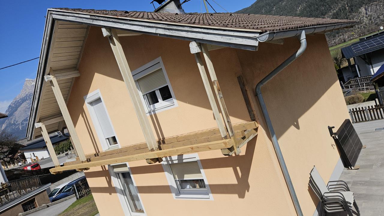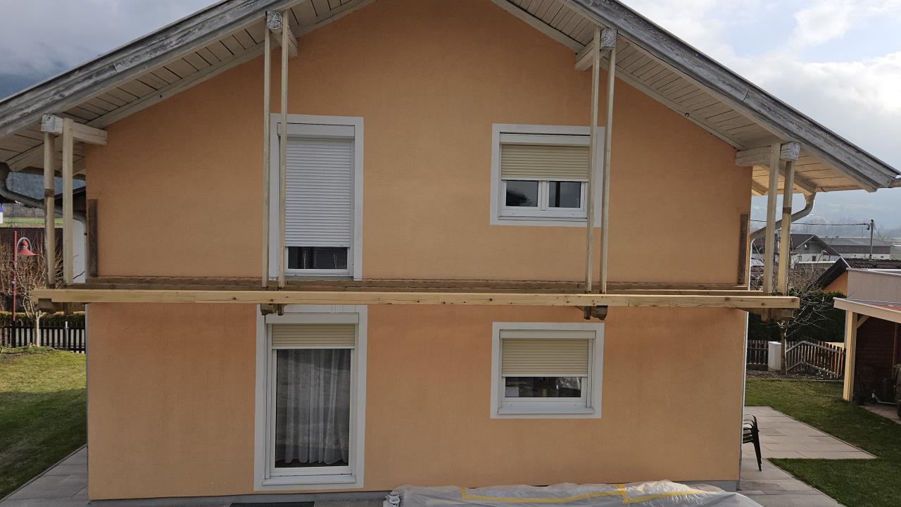 Ein säulenfuß und eine Holzsäule dazu. Der Fuß wird mit 4 Schrauben nach unten geschraubt. Die Säule hat eine Nut für den Fuß, dann wird eine Schraube durchgesteckt und auf der Anderen Seite die Schraube angezogen. Es geht mir nicht um die Konstruktion mit den Zangen. Die ist stabil. Der vorderste Sparren (hell) wurde von uns getauscht, da bei jedem Punkt, wo ein Säulenfuß reingeschaut war, verfault. Auf die drei Sparren kommt die Bretterschicht zum gehen. Da werden dann wieder die Säulenfüße von oben draufgeschraubt. Und hier will ich abdichten unter dem Säulenfuß, und die 4 Schrauben, dass das Wasser nicht wieder vom Balkonboden in den Sparren rinnen kann. Hier noch ein Foto der Konstruktion aktuell. Die Zangen von oben sind generell recht mutig. Ist ein mal durchgeschraubt und noch 4 zusätzliche Holzschrauben seitlich zu sehen. Das Haus selber ist ca. 80-90 Jahre alt. |