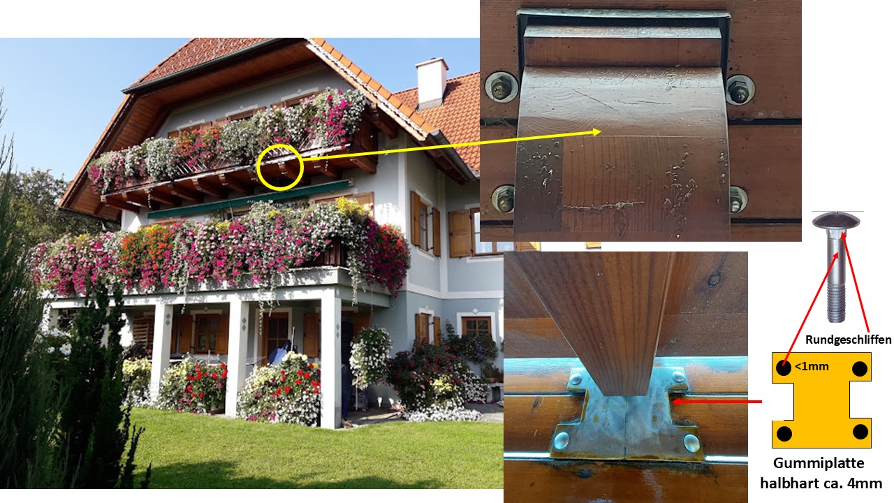 Das Vorsetzen der Geländerpfosten und Zangenpaare von oben (auf die Vorderseite des vorderen Balken) würde die Durchdringung der Abdichtung vermeiden, aufgesetzte Steher sind nur schlecht dicht zu bekommen. |