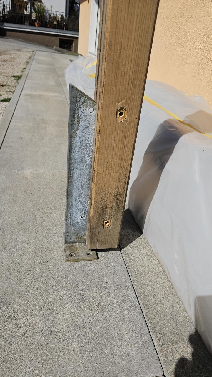 Ich würde eher das Gegenteil vorschlagen: Abstandshalter oder zentrale Befestigung ohne Platte. Das Holz muss gut abtrocknen können damit man der Fäule entgegenwirkt. Mit diesem Bild konstruktive Empfehlungen auszusprechen ist leider nicht möglich, da muss schon mehr kommen :) |
