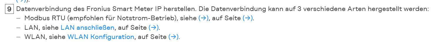 Im Notstrommodus kommuniziert der Gen24 mit dem Fronius IP Smartmeter ebenfalls über das normale Modbus RTU protokoll, da die Ethernet Infrastruktur ja auch vom Ausfall betroffen ist (bis der WR WR [Wechselrichter] wieder da ist) https://manuals.fronius.com/html/4204260464/de.html#0_m_0000032547 |
