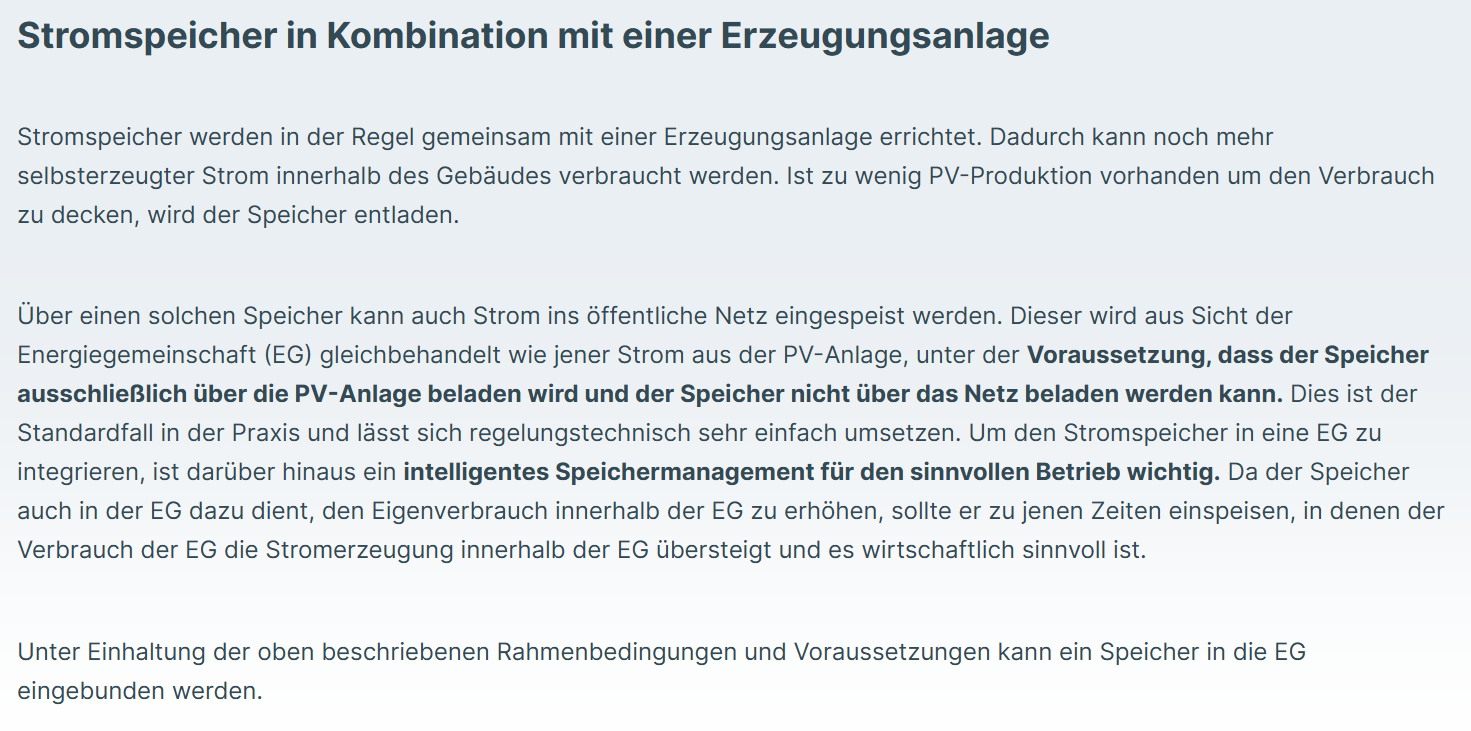 Wenn du so einen Netzbetreiber hast, einfach (konstruktiv) der e-Control melden oder die Koordinationsstelle kontaktieren. Die Koordinationsstelle für Energiegemeinschaften hat gemeinsam mit der e-Control, Österreich Energie (in Vertretung für die Netzbetreiber) und dem Ministerium diese Sache letztes Jahr gemeinsam geklärt - weil es eben unterschiedliche Interpretationen von Mitarbeitern der Netzbetreiber gegeben hat. Das "Verbot" eines Netzbetreibers würde die Umsetzung der gesetzlichen Grundlage für EGs zuwider laufen, deshalb wurde das zwischen den offiziellen Stellen abgestimmt und geklärt. Bitte die u.a. Rahmenbedingungen berücksichtigen . https://energiegemeinschaften.gv.at/speichereinbindung-in-energiegemeinschaften/ |