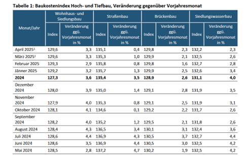 Update - April Zahlen: Im April lagen die Kosten für den Wohnhaus- und Siedlungsbau laut Statistik Austria (wie auch im März) um 3,3% über dem Vorjahreswert. |