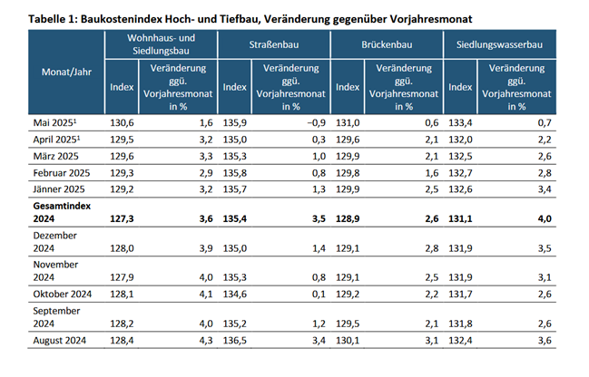 Update Mai-Zahlen: Die Baukosten sind auch im Mai gestiegen - im Wohnungs- und Siedlungsbau um 1,6% über dem Vorjahresmonat, einzig der Straßenbau liegt um 0,9% unter dem Vorjahreswert |