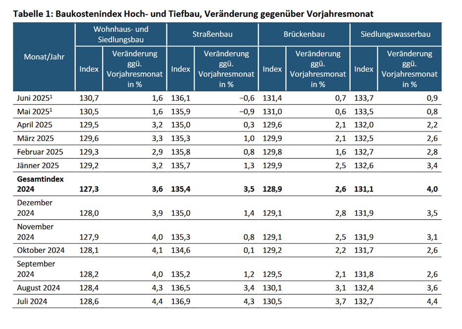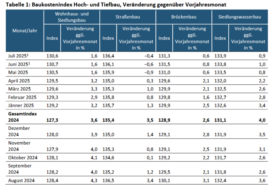 Update Juli-Zahlen: Bis auf den Straßenbau sind verglichen mit Juli 2024 alle Indizes weiter gestiegen. |