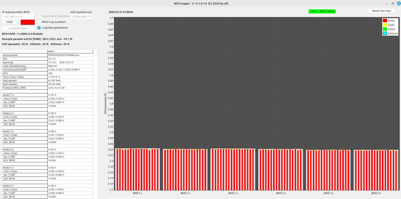 Sehr gut, das sieht schon mal gut aus. ist ja wirklich eine jungfräuliche Batterie mit 60 kWh. Bei 32% SoC schauen alle Batterien so aus wie deine, das liegt an der flachen Ladekurve von LFP Batterien. Die Spreu trennt sich vom Weizen in den letzten Sekunden vor dem Ladeende bei 3,65V. Lade deine Batterie zumindest einmal voll, wenn zuwenig Energie vom Dach kommt, sperre halt die Entladung bis sie voll ist. Du hast die Logging aktiviert, daß ist gut, denn es geht wirklich um ca. 30 Sekunden die viel über deine Batterie aussagen. Also, einmal vollladen (mit Log file) und falls das passiert wenn du nicht live zuschauen kannst, schau es dir später im Logfile an. Kopier den Screen die letzte Sekunde vor Ladeende und dann schauen wir weiter. |