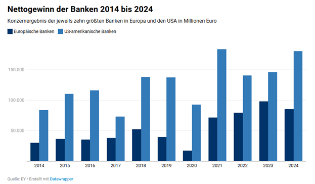 Zum Vergleich die nachweislichen Nettogewinnunterschiede 2014-2024 auch zwischen den Top 10 europäischen und US-Banken: