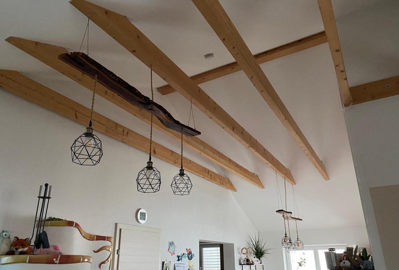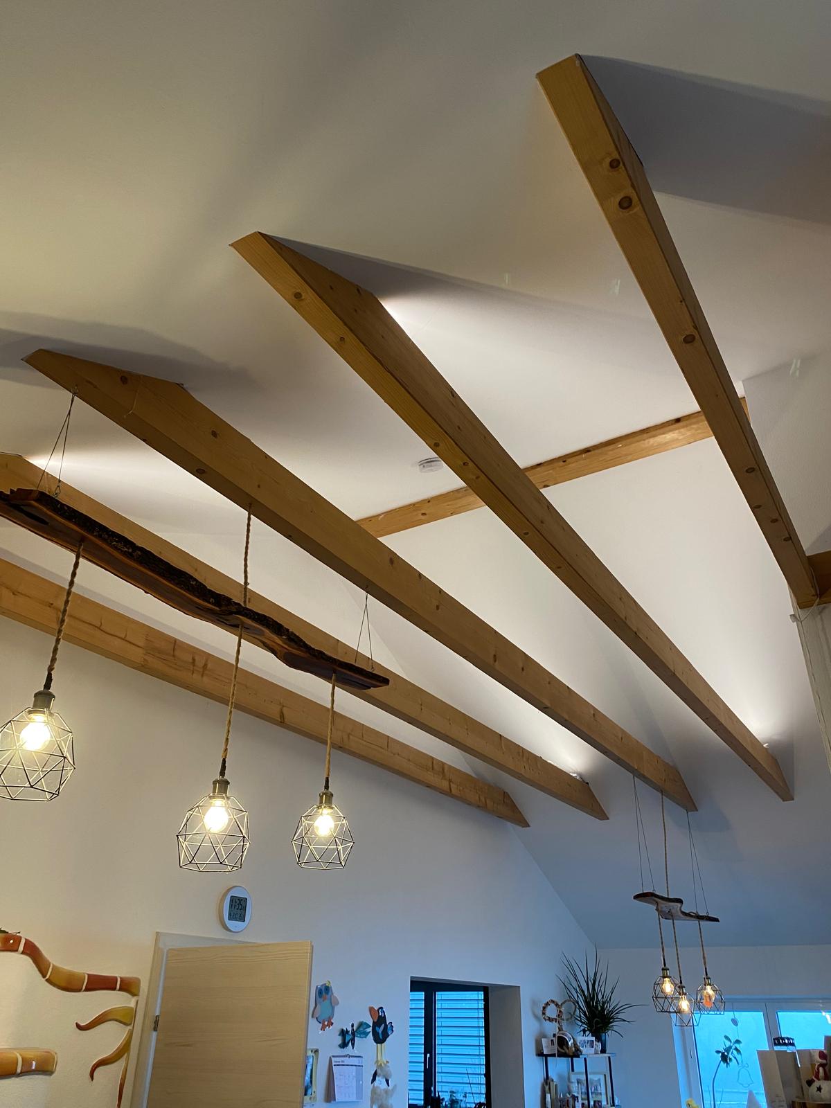 Ich hab es damals so realisiert. Entschuldigt die Bildqualität, mein Handy ist schon etwas älter. Zangen sind bei jedem Balken angeschraubt worden. Man braucht da für die Dampfbremse jede Menge Rollen Dichtklebeband. Dämmung und GKP Montage+Spachteln war relativ einfach dafür, da das Gerüst bis zu den Zangen gegangen ist und über den Zangen hatten wir uns mit aufgelegten Schalltafeln bewegt. Das Abkleben für Putz, Spachteln, Malen war problemlos. Zangen einfach eingewickelt in Plastifolien und hier und da rundherum mit Klebeband gewickelt. Die Lampen hab ich selber gebastelt da ich noch genug Holz von meinem alten Kirschbaum hatte. Alles andere bekommt man eh vom Baumarkt. Über den Zangen sind überall Elektroinstallationen, hauptsächlich auch für die indirekte LED Beleuchtung nach oben. Ich muss dazu aber auch sagen, dass ohne unserem Kachelofen (links unten) es doch anstrengend für unsere FBH FBH [Fußbodenheizung] wäre, auf angenehme Temperaturen (für die Kinder) zu kommen. Kommt aber auch darauf an, was man für Temperaturen gewohnt ist. Der Kachelofen ist ja eigentlich eh ein Overkill und heizt eher zuviel als zu wenig. Akustisch ists kein Problem, haben aber auch einen eher rauen Putz genommen, welcher weniger Schall reflektiert. Das Abstauben sowie Spinnweben entfernen (die erkennt man mit der indirekten Beleuchtung gut) wird mit einem Teleskopbesen mit Borsten im Widerhaken vorgenommen. Manchmal gehe ich auch mit der Leiter hoch um bei der Pfette den Fliegenkot wegzuputzen. Rauchmelder ist mit 10-Jahre Akku ausgestattet und per Bluetooth test- und deaktivierbar (Ansonsten mit Teleskopbesen manuell zu muten). Hoffe, diese Information hilft für die Ideenbildung. mfG Amon |