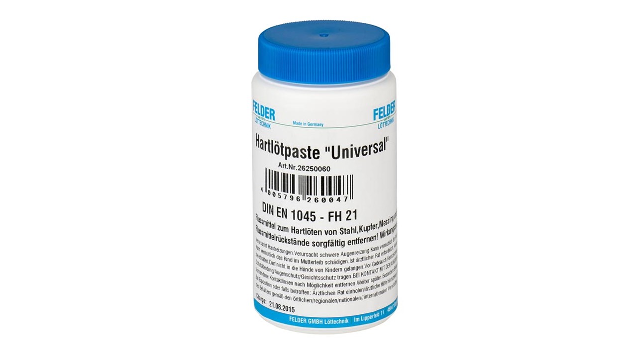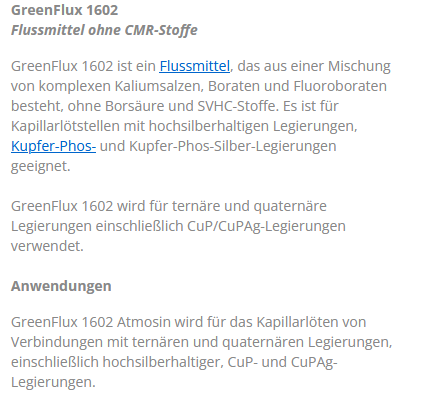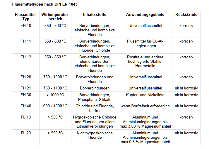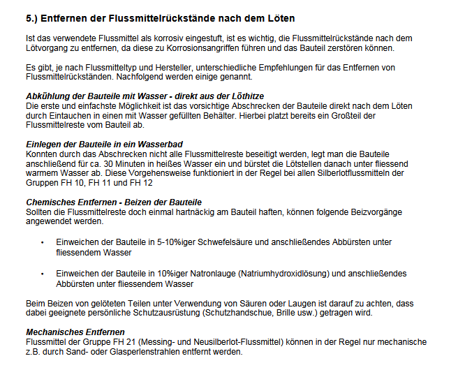 Viele Flußmittel sind korrosiv. Bei Verwendung dieser, sollte man die Lötstelle gut mit Wasser reinigen. Flußmitteltyp (Universalflußmittel)  FH21 ist nicht korrosiv. Hinterlässt aber auch diese weißen Spuren.  Ich verwende  für das Silberlot (ca. 56%)  Flußmittel vom Typ FH10 für Kältemittelkreise.