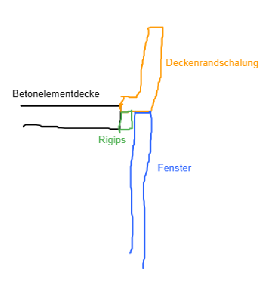 Wir bekommen eine Betonelementdecke. Das heißt, die Deckenrandschalung könnte einfach 5cm höher gesetzt werden und damit entsteht eine kleine Stufe wo dann das Fenster eingeschäumt/verschraubt wird. Damit wäre es innen auf alle Fälle bündig mit der Decke. Und wenn das Fenster nicht "dick genug" ist, dann ist innen noch eine Trockenbauplatte eingespachtelt.